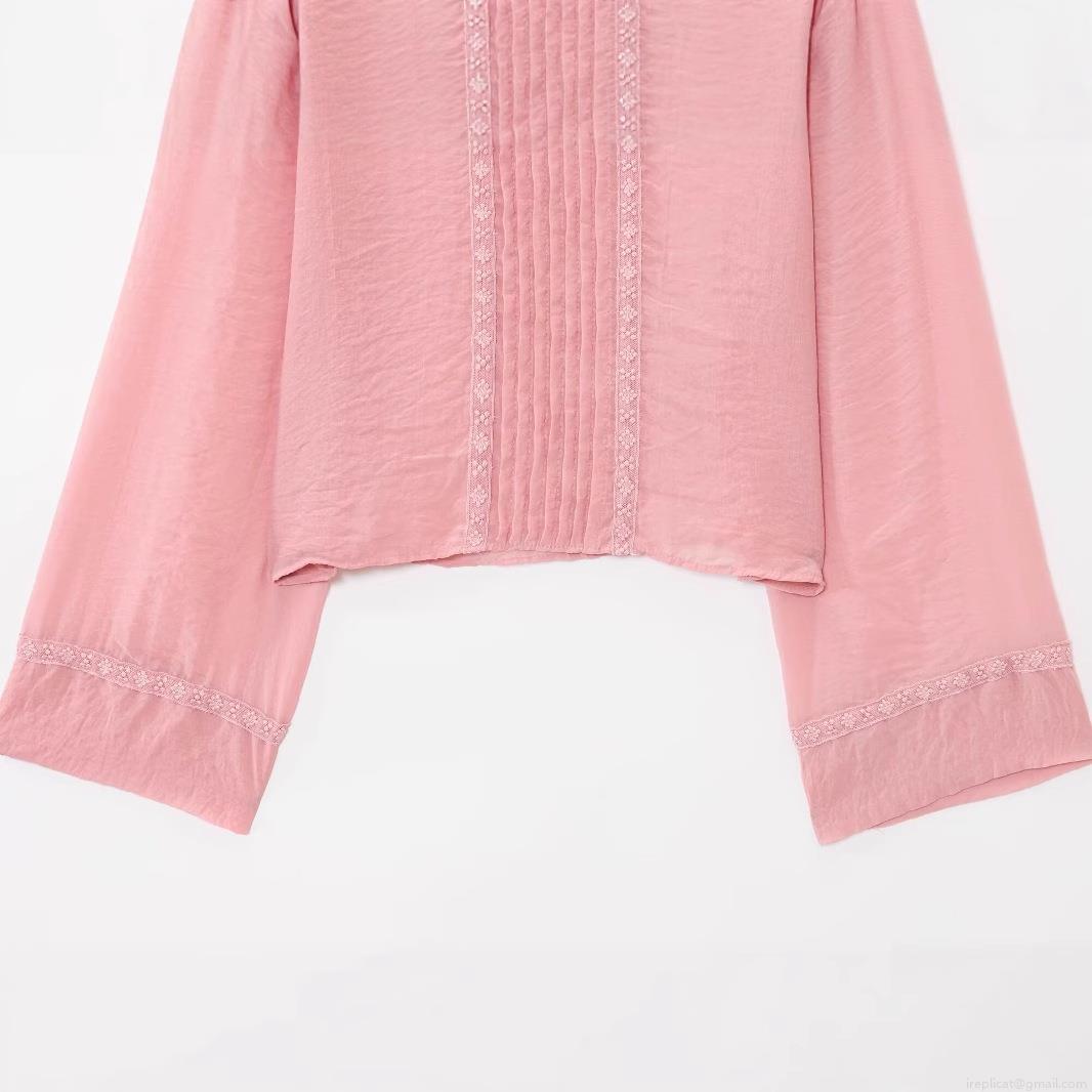 Women's Elegant Tencel Pink Blouse With Lace Trim Pleated Ruffles Long Sleeve Standing Collar Sweet Shirt For Daily Office Party Ladies Tops