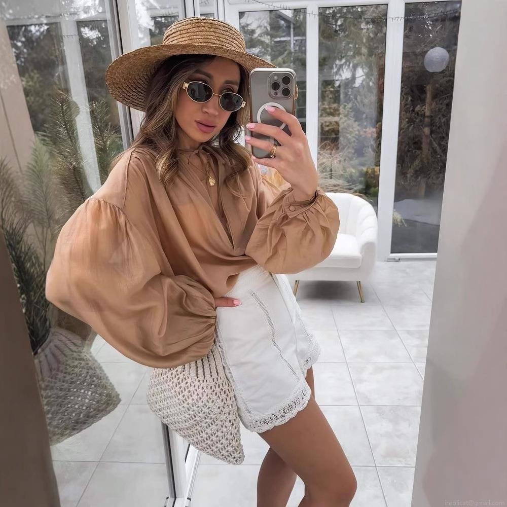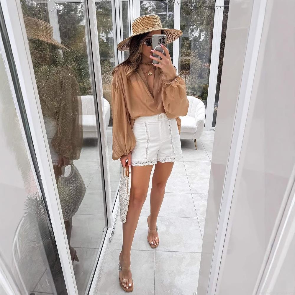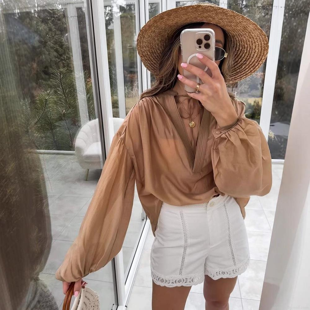 • Women's Elegant V Neck Lantern Long Sleeve Blouse Solid Color Single Breasted Polyester Chiffon Shirt For Vacation Daily Wear