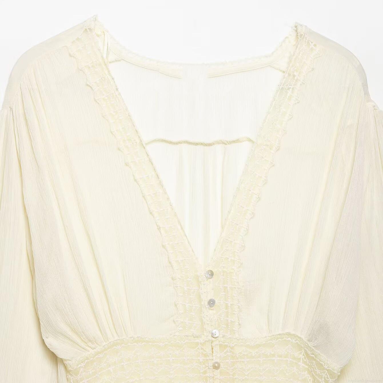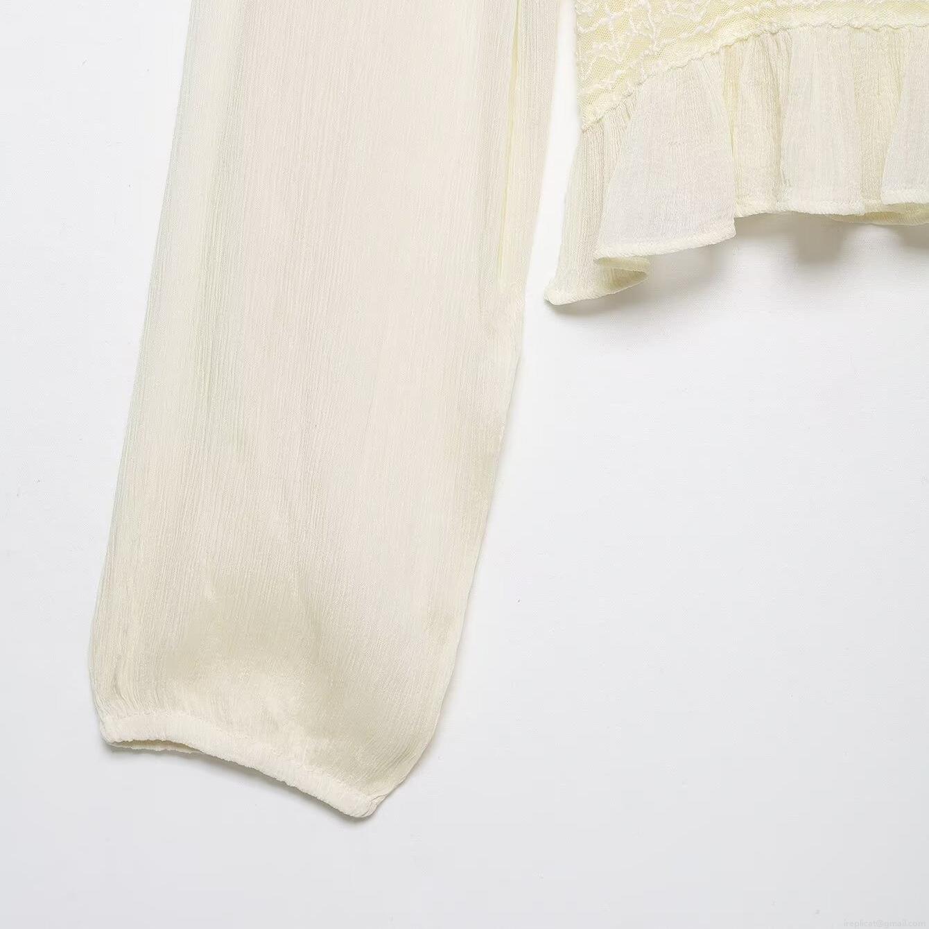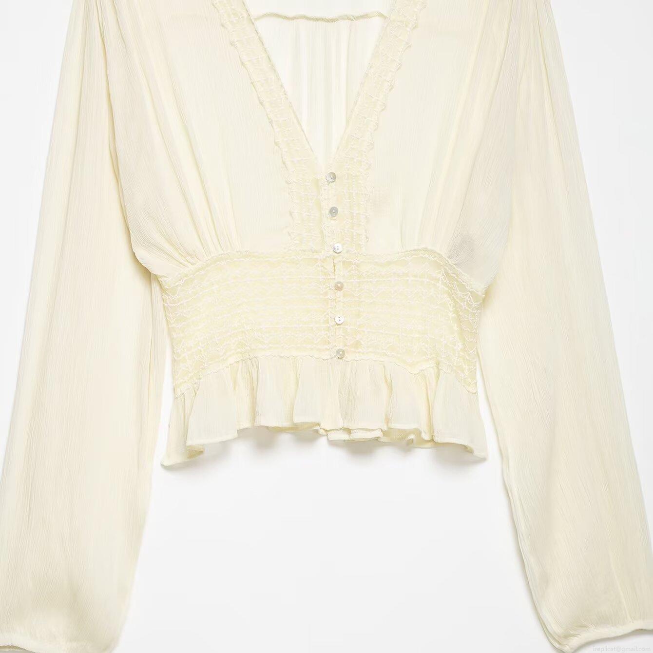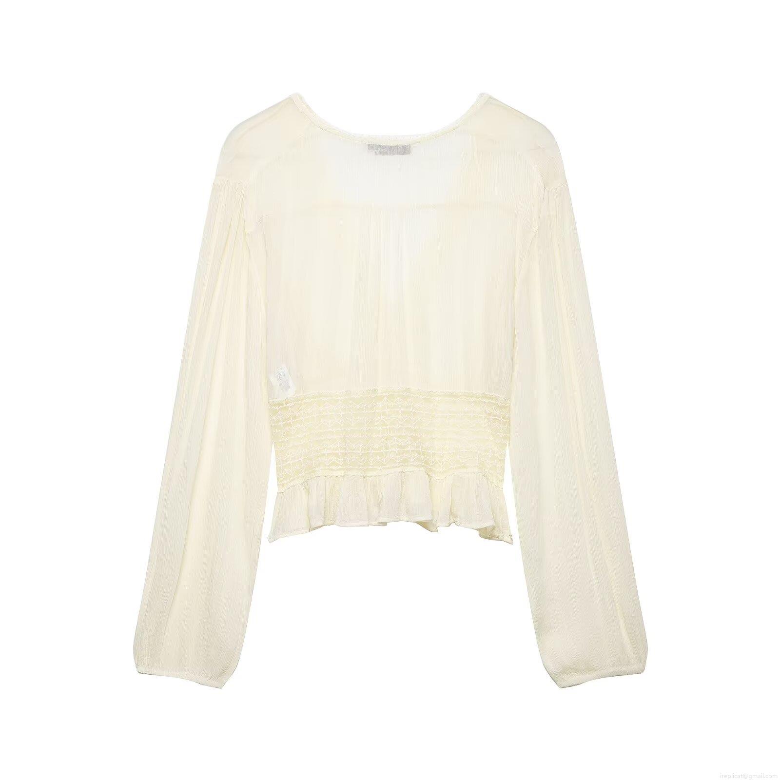 • Women's Elegant V Neck Long Sleeve Blouse Lace Patchwork Smocked Waist Ruffle Hem Shirt Top Milky White Casual Soft Polyester Blouse For Ladies