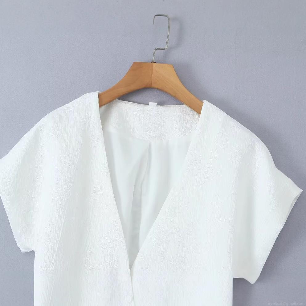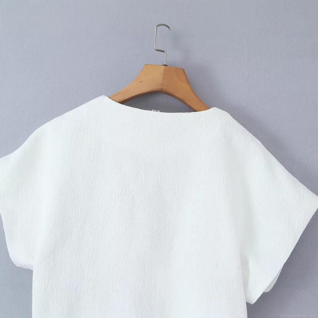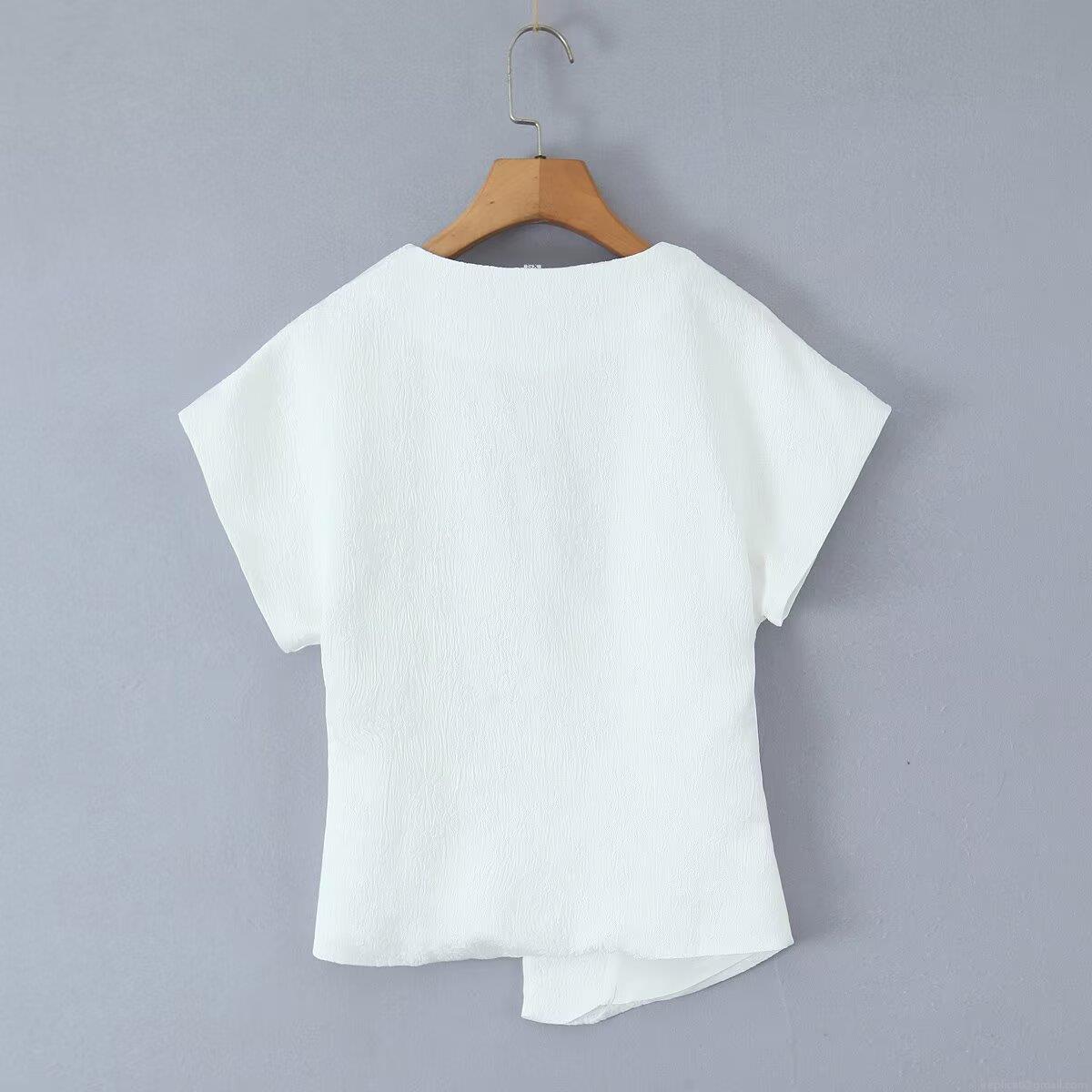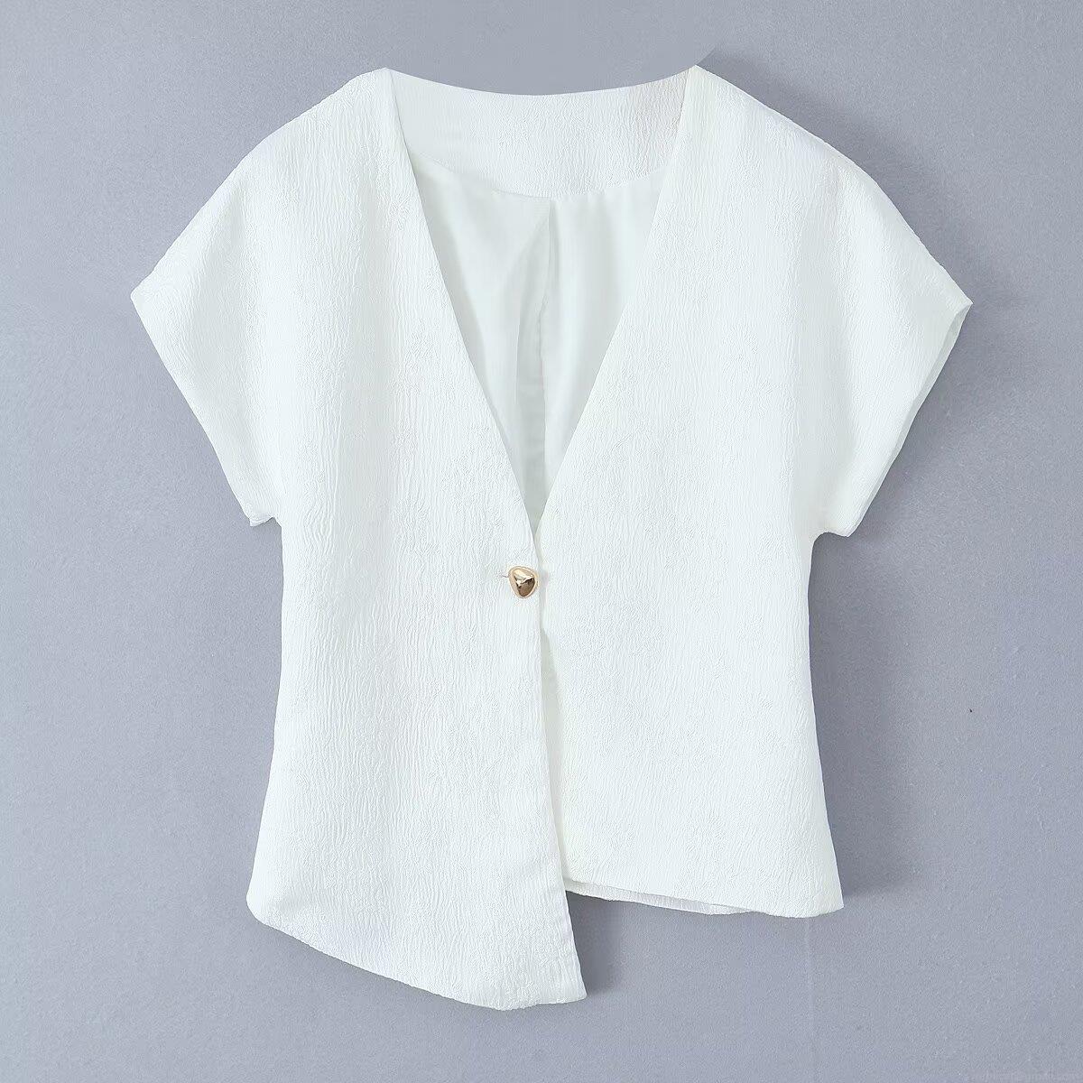 • Women's Elegant V Neck Short Sleeve Top Textured Crepe Blouse Asymmetrical Hem With Gold Heart Button Summer Casual Fashion Streetwear White