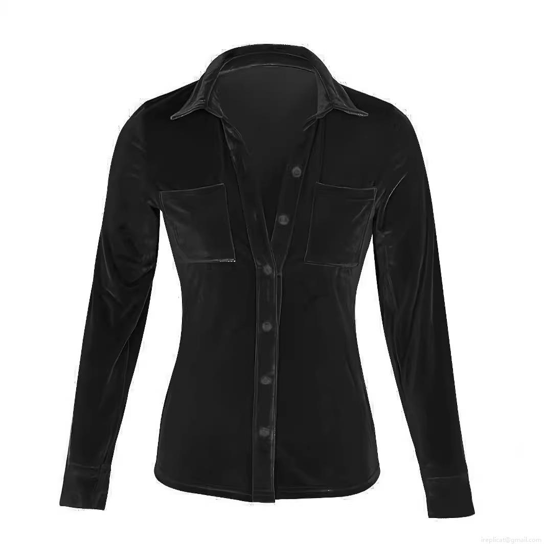 • Women's Elegant Velvet Luster Long Sleeve Blouse Solid Color Button Down Shirt With Pockets Casual Office Slim Fit Tops Plus Size