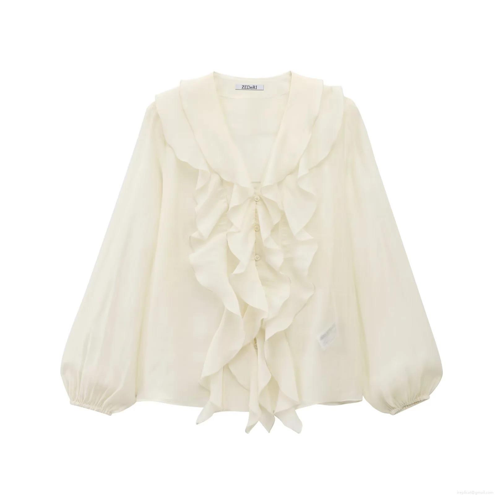Women's Elegant V-Neck Cascading Ruffle Chiffon Blouse Solid Color Long Sleeve Tencel Shirt Casual Loose Top for Party Daily