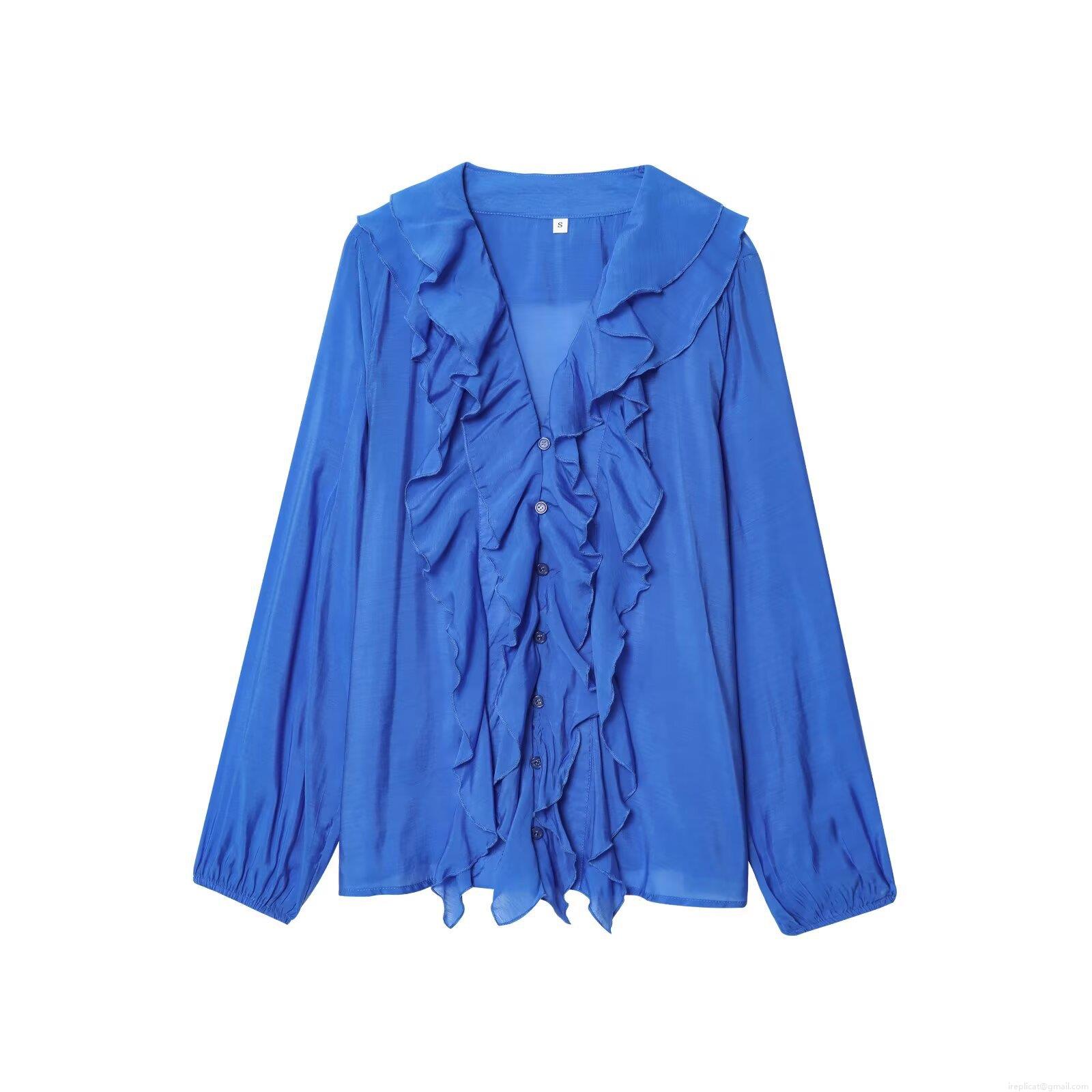 • Women's Elegant V-Neck Cascading Ruffle Chiffon Blouse Solid Color Long Sleeve Tencel Shirt Casual Loose Top for Party Daily