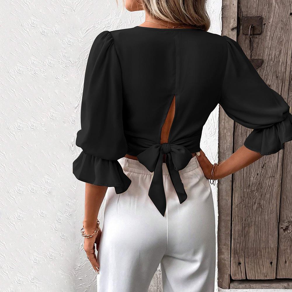 • Women's Elegant V-neck Puff Sleeve Crop Top Backless Bow Tie Blouse Solid Color Slim Fit Polyester Shirt for Summer Daily Fashion