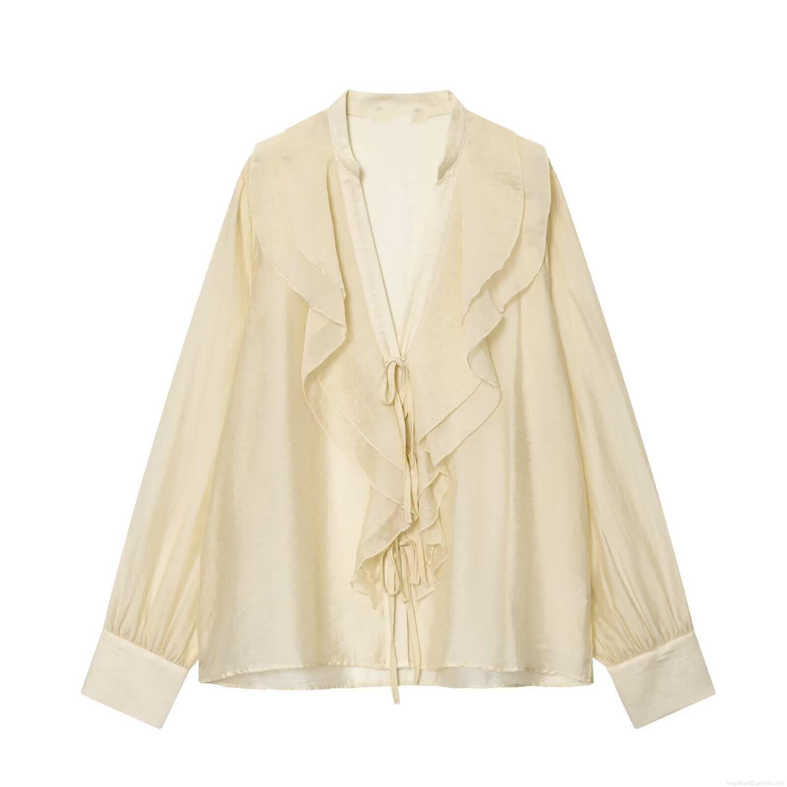 Women's Elegant V-Neck Ruffle Blouse Long Sleeve Tie-Front Solid Color Polyester Spandex Blended Top For Casual Office Dating Sweet Style Cream Yellow Shirt