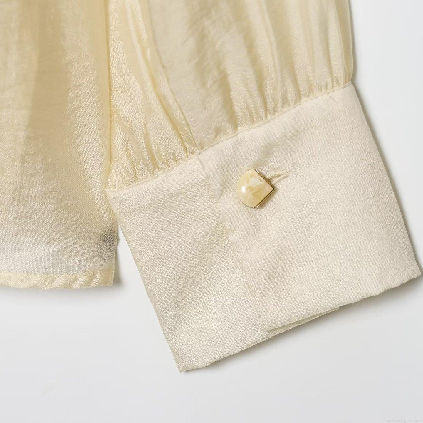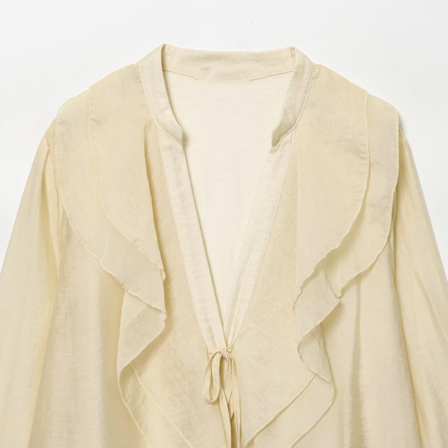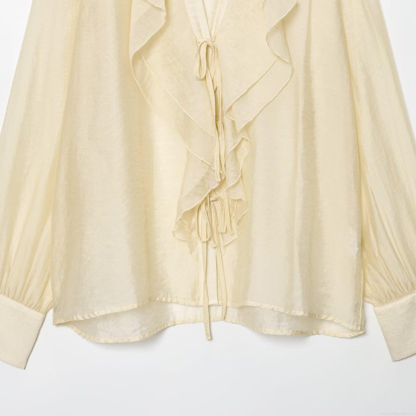 • Women's Elegant V-Neck Ruffle Blouse Long Sleeve Tie-Front Solid Color Polyester Spandex Blended Top For Casual Office Dating Sweet Style Cream Yellow Shirt