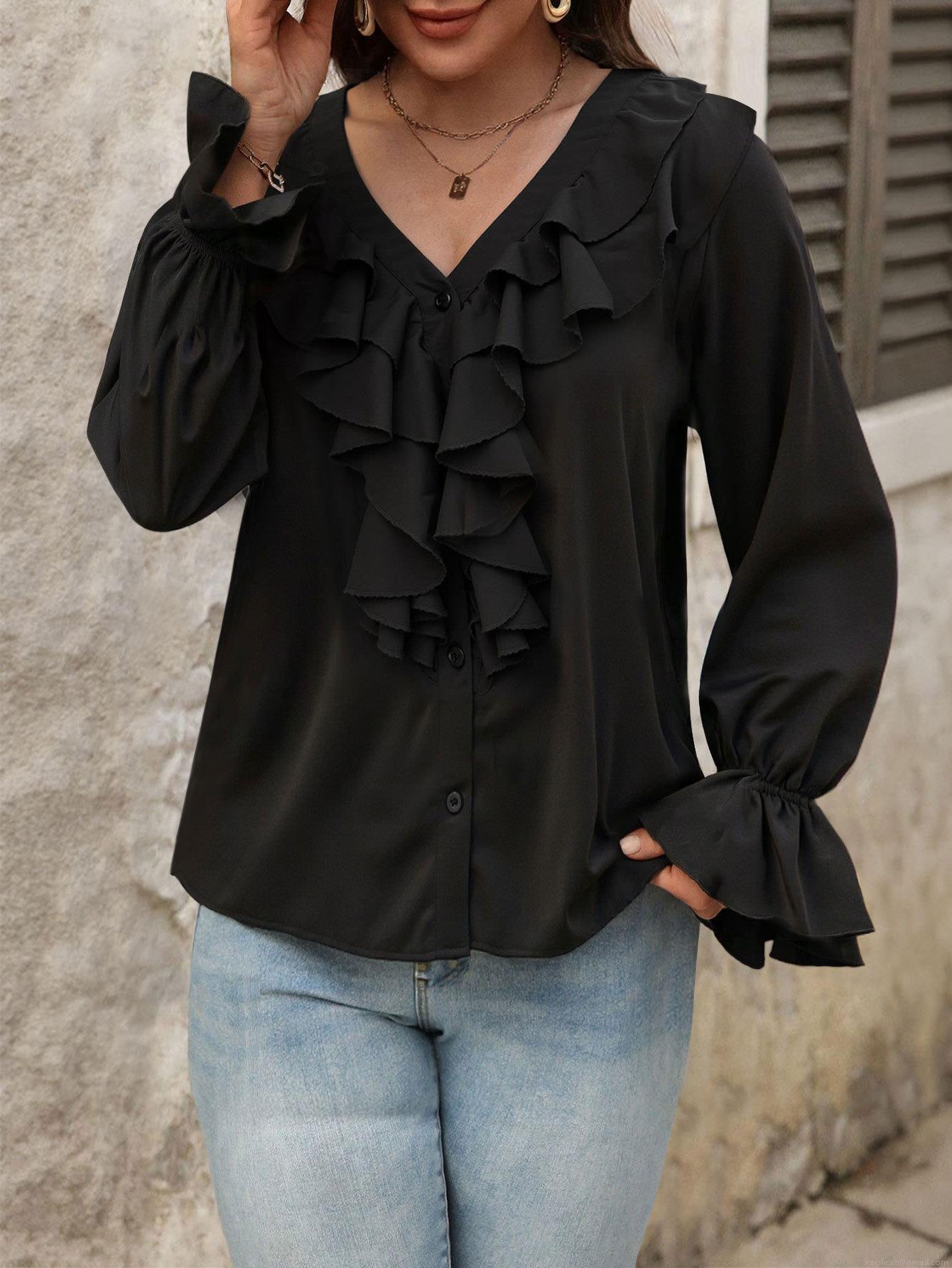 • Women's Elegant V-Neck Ruffle Blouse Polyester Spandex Long Sleeve Solid Color Pleated Shirt For Office Daily Casual Wear French Style Chic Tops