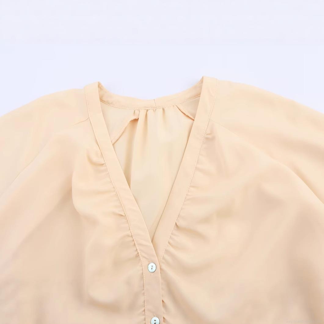 Solid Color, Puff Sleeves, Satin Finish, Deep V-neck, Vertical Design