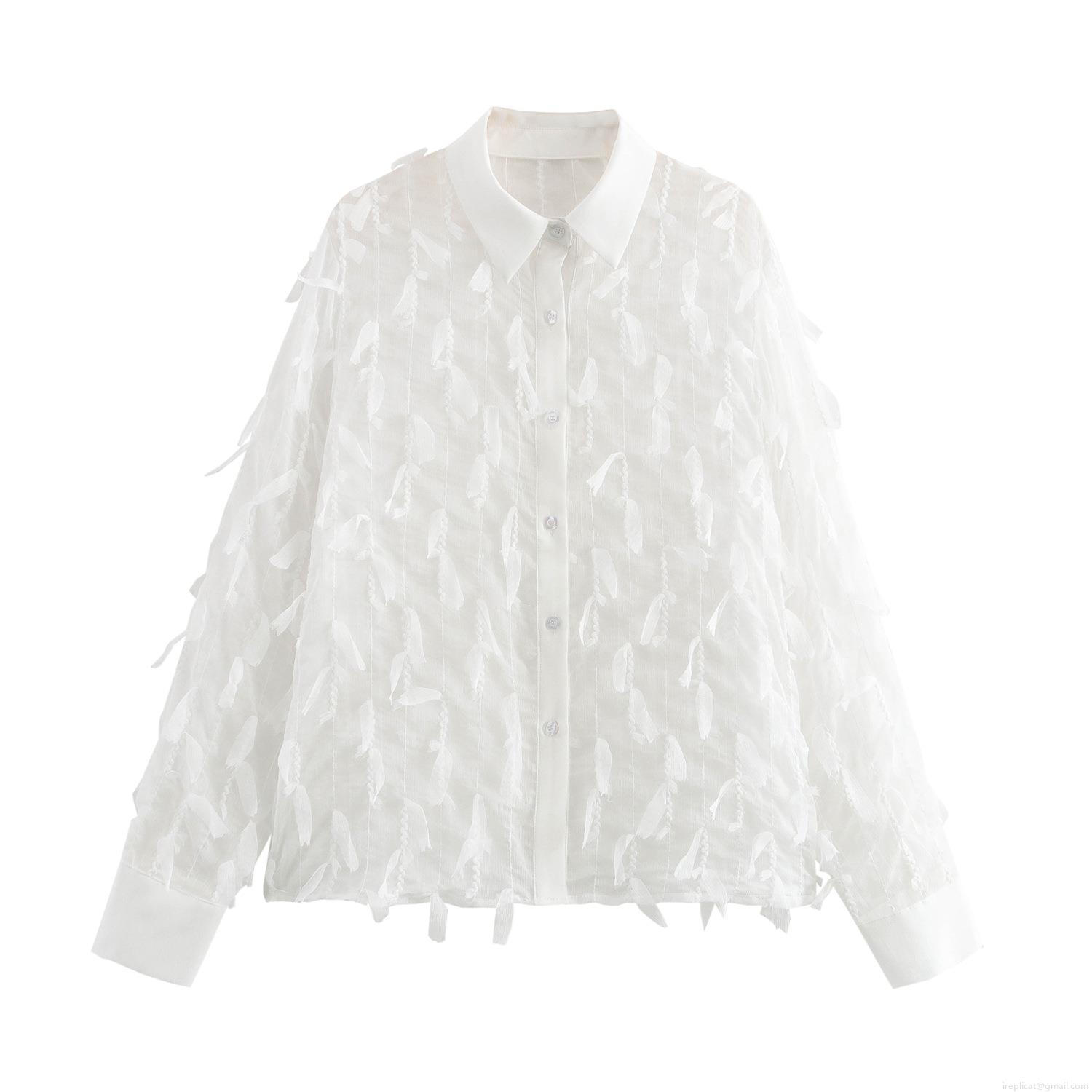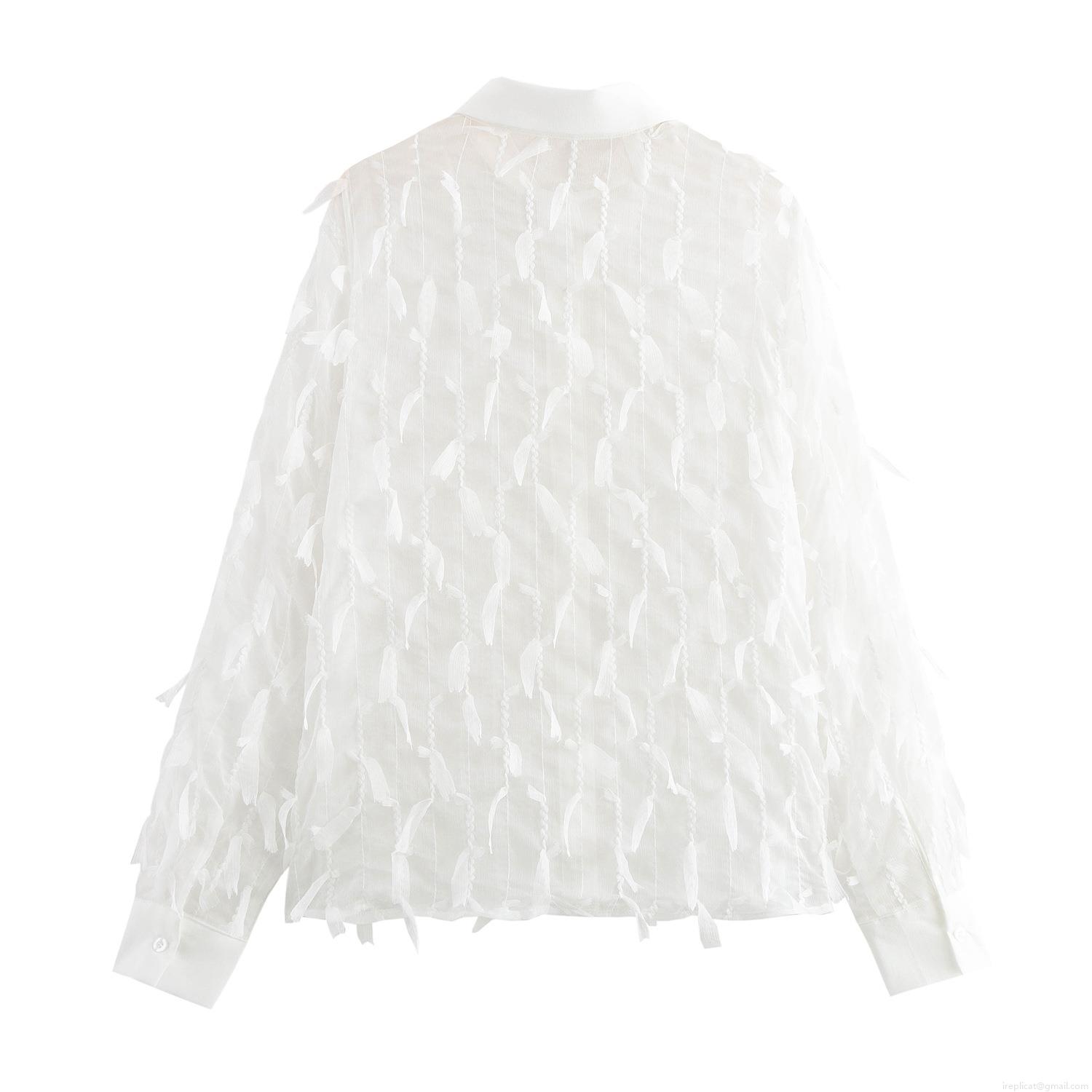 • Women's Elegant White Blouse Long Sleeve Lapel Collar Textured Fringe Tassel Design Solid Color Loose Fit Button Down Shirt For Office Party Ladies Tops