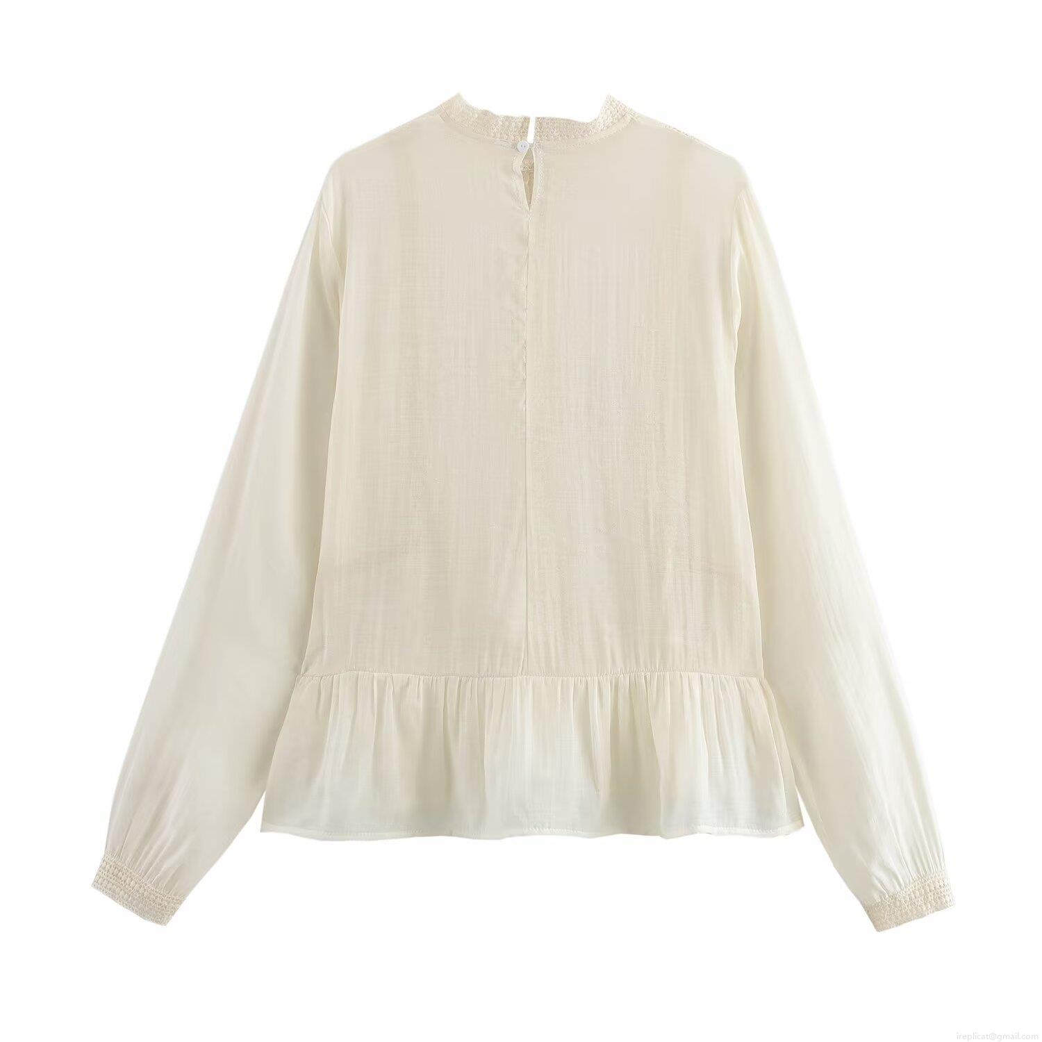 • Women's Elegant White Chiffon Blouse With Lace Patchwork Ruffle Hem Stand Collar Long Sleeve Pullover Shirt For Daily Lady Office Solid Top
