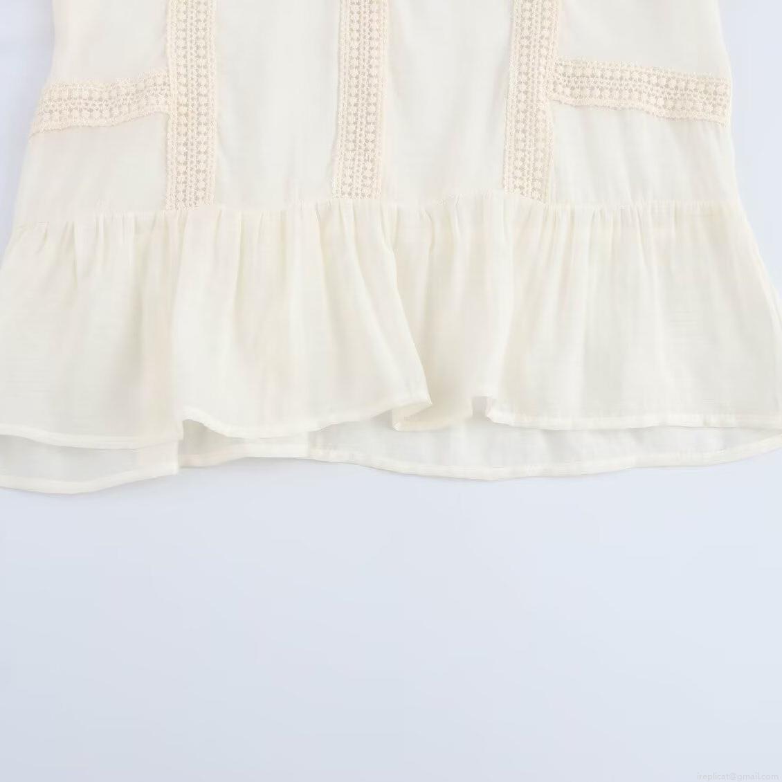 Women's Elegant White Chiffon Blouse With Lace Patchwork Ruffle Hem Stand Collar Long Sleeve Pullover Shirt For Daily Lady Office Solid Top