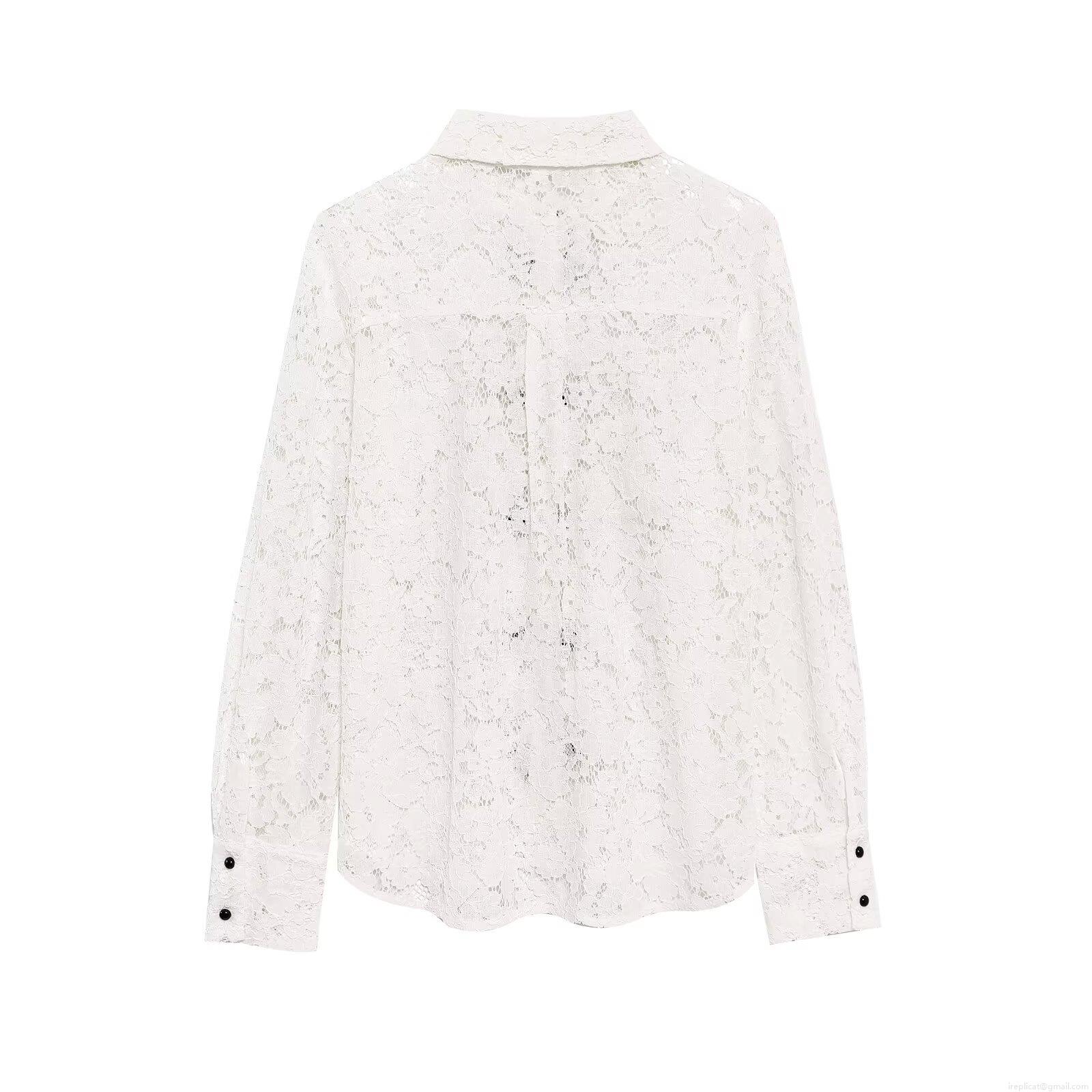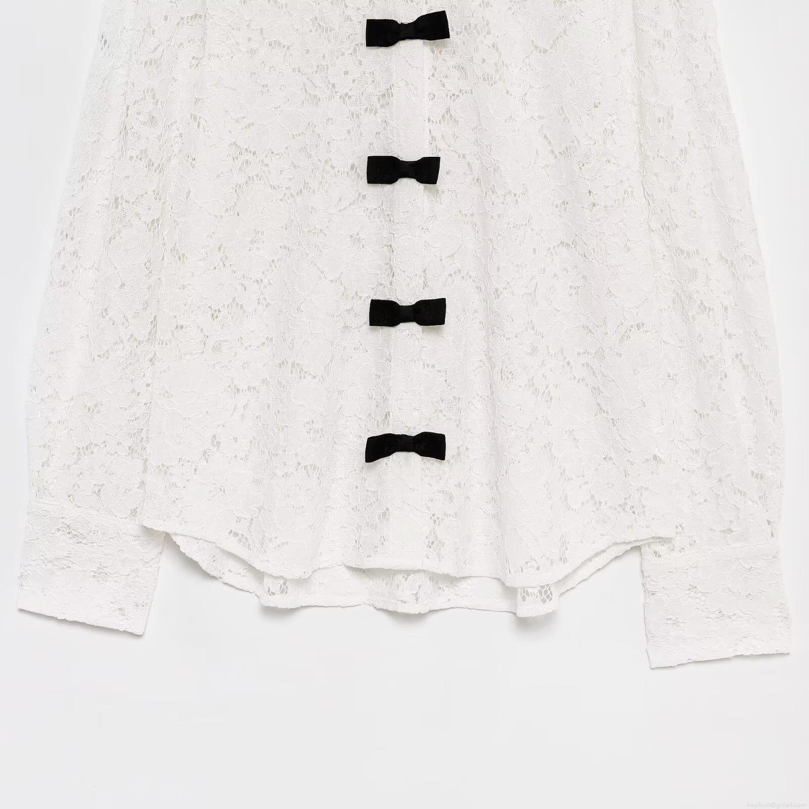 • Women's Elegant White Floral Lace Long Sleeve Blouse Featuring Contrast Black Bow Decoration Sweet Shirt Collar Button Down Top For Daily Dating