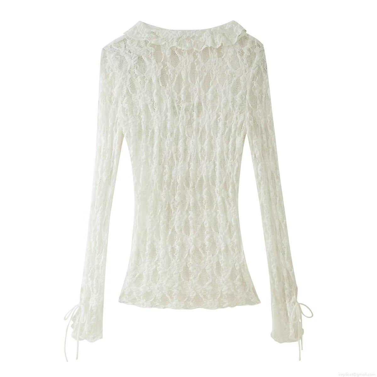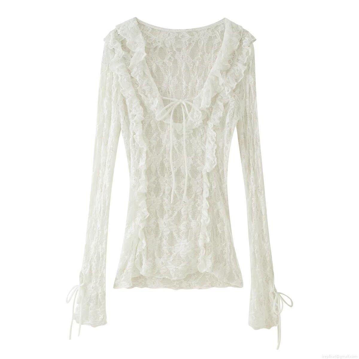 • Women's Elegant White Lace Blouse Long Sleeve V-Neck Layered Ruffle Tie-Up Bow Fashion Top For Dating Party Sweet Sheer Mesh Polyester Shirt