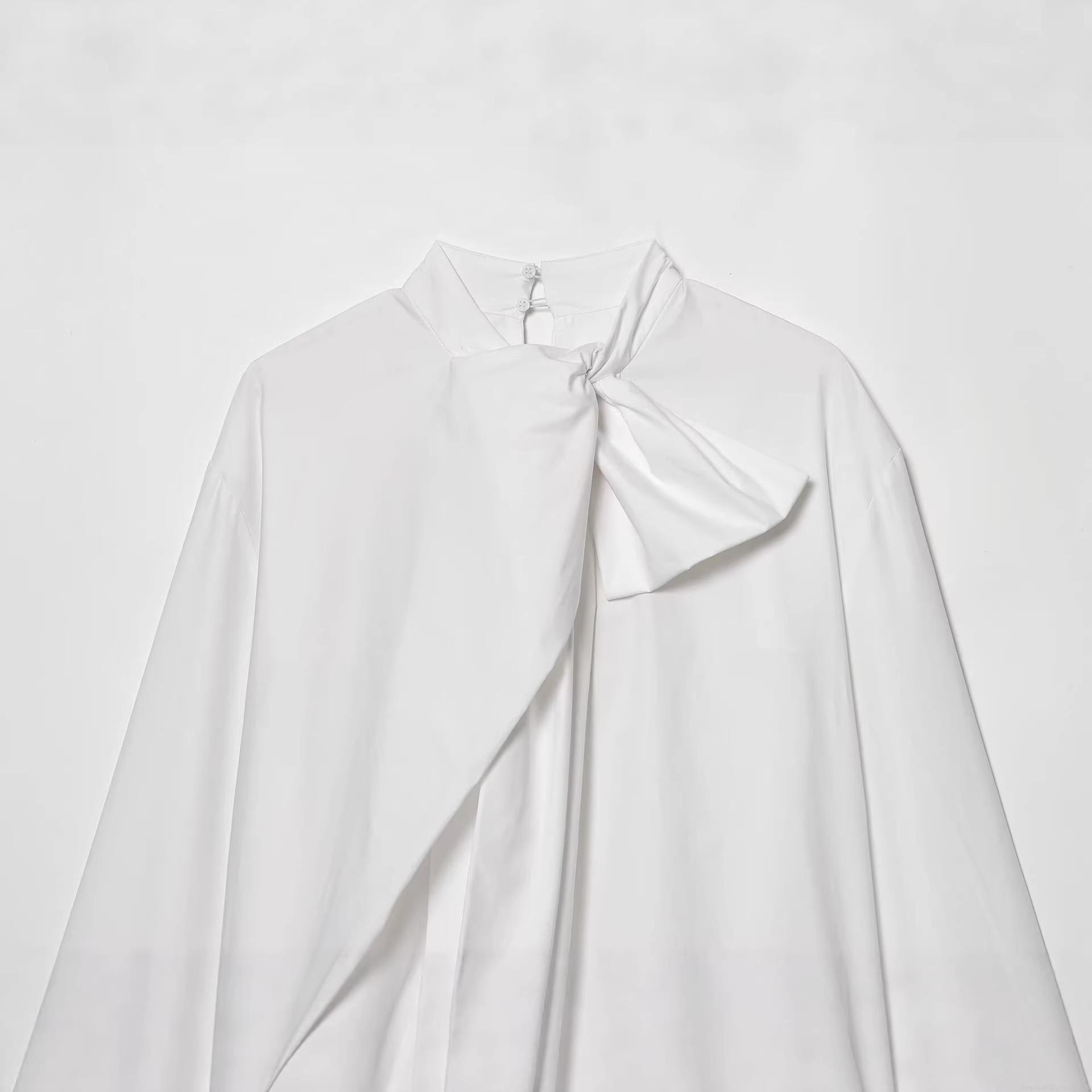 Women's Elegant White Poplin Blouse Oversized Bow Tie Long Sleeve Shirt Fashion Casual Office Wear Sweet Style Top Lady Clothing