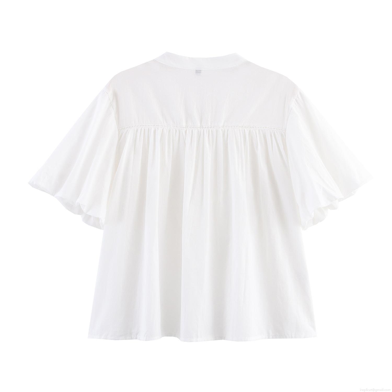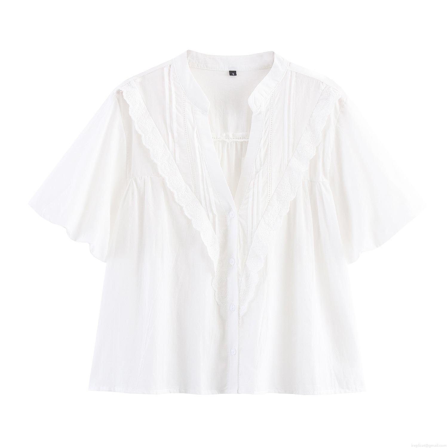 Women's Elegant White V Neck Blouse 85% Cotton Lace Trim Ruffle Lantern Short Sleeve Button Down Casual Top Shirt for Women