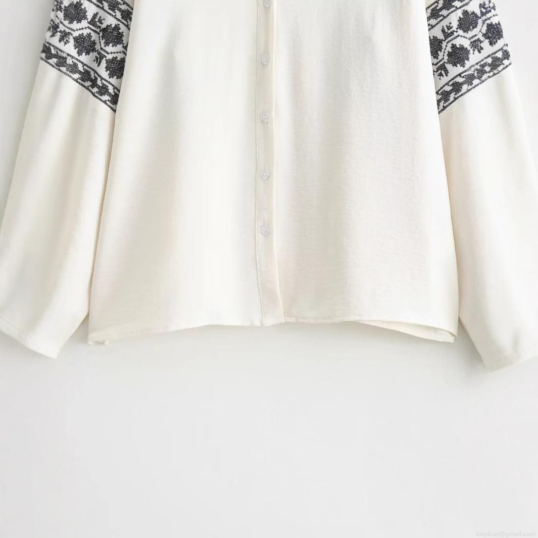 • Women's Ethnic Geometric Embroidered Blouse 100% Polyester Lantern Long Sleeve V-Neck Button Up Shirt Boho Style Cream White Tops for Ladies