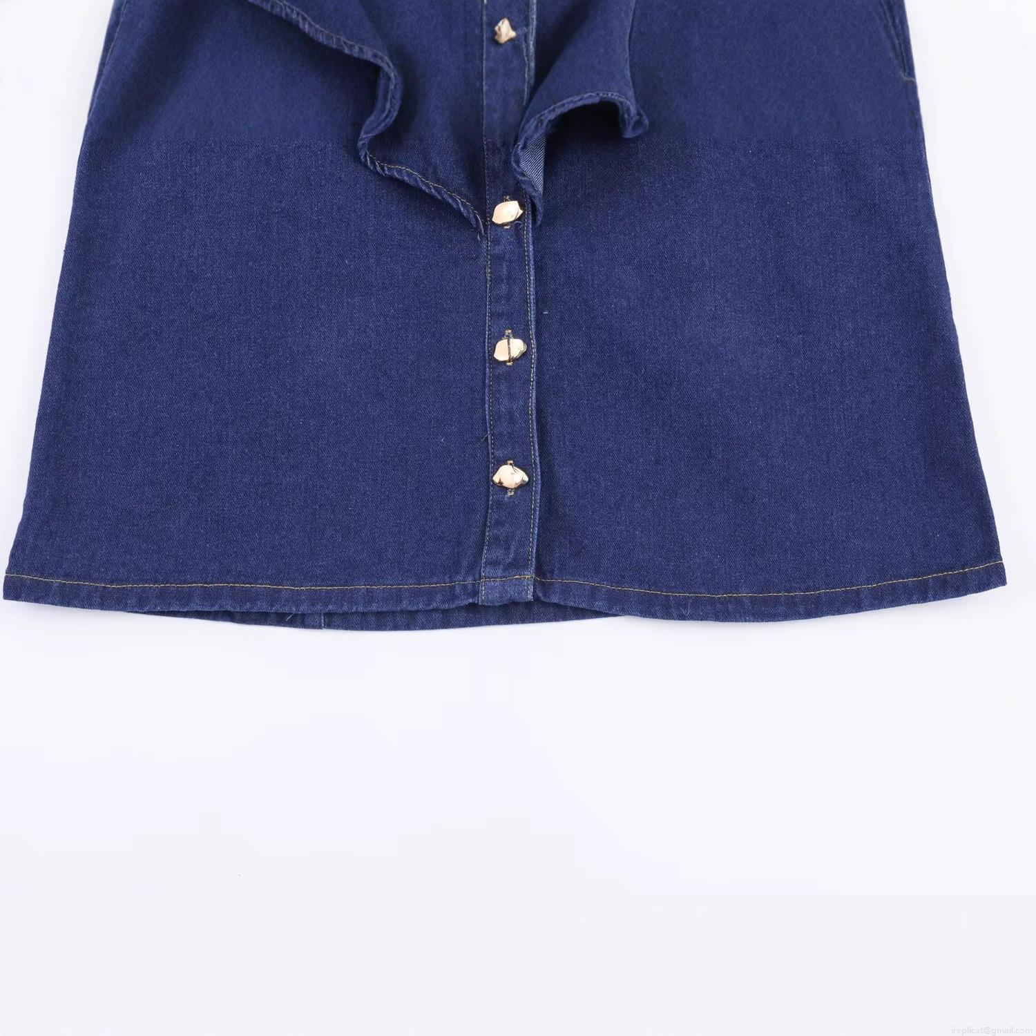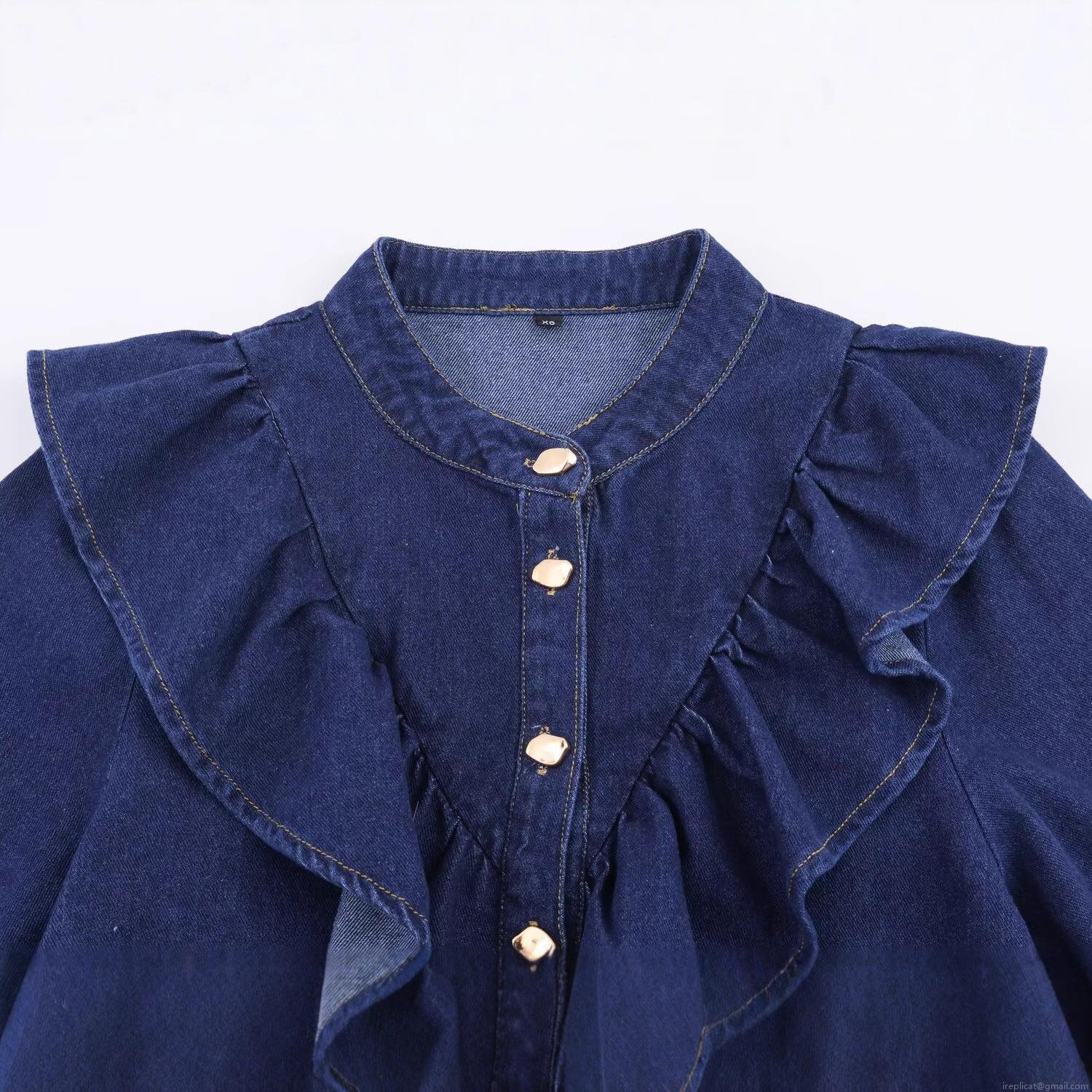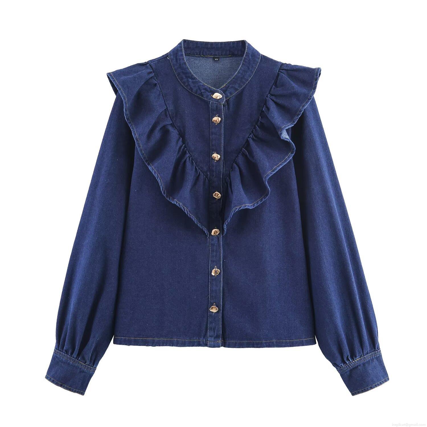 • Women's European Style Ruffle Long Sleeve Denim Shirt Casual Dark Blue Cotton Blend Blouse Top With Heart Shaped Metal Buttons