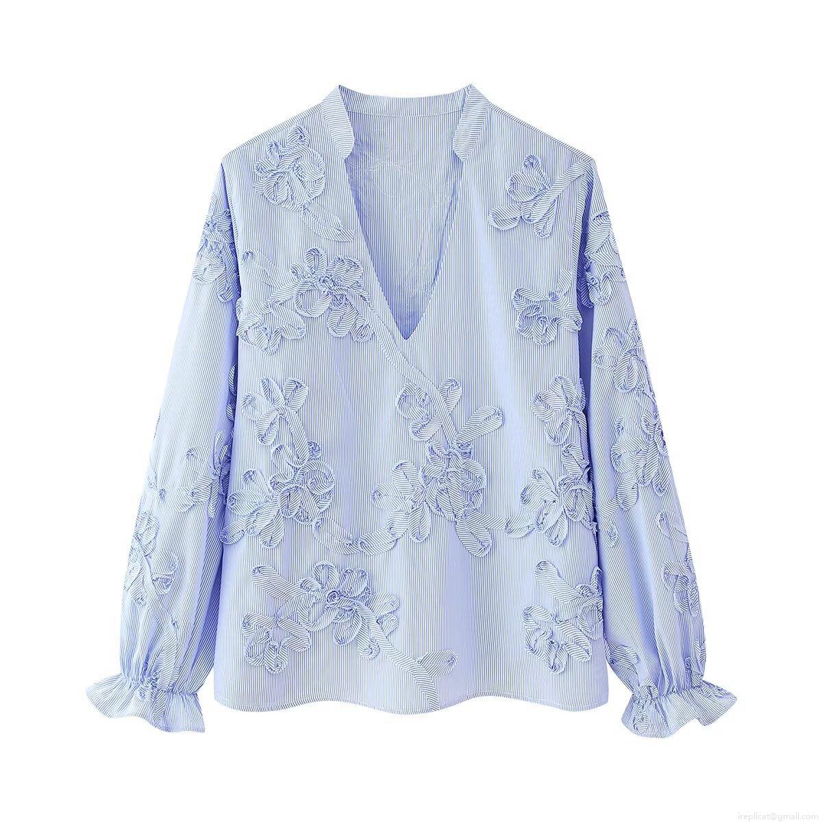 • Women's European Style V-Neck Lantern Sleeve Striped Shirt With 3D Floral Applique Ruffle Cuff Long Sleeve Polyester Casual Top