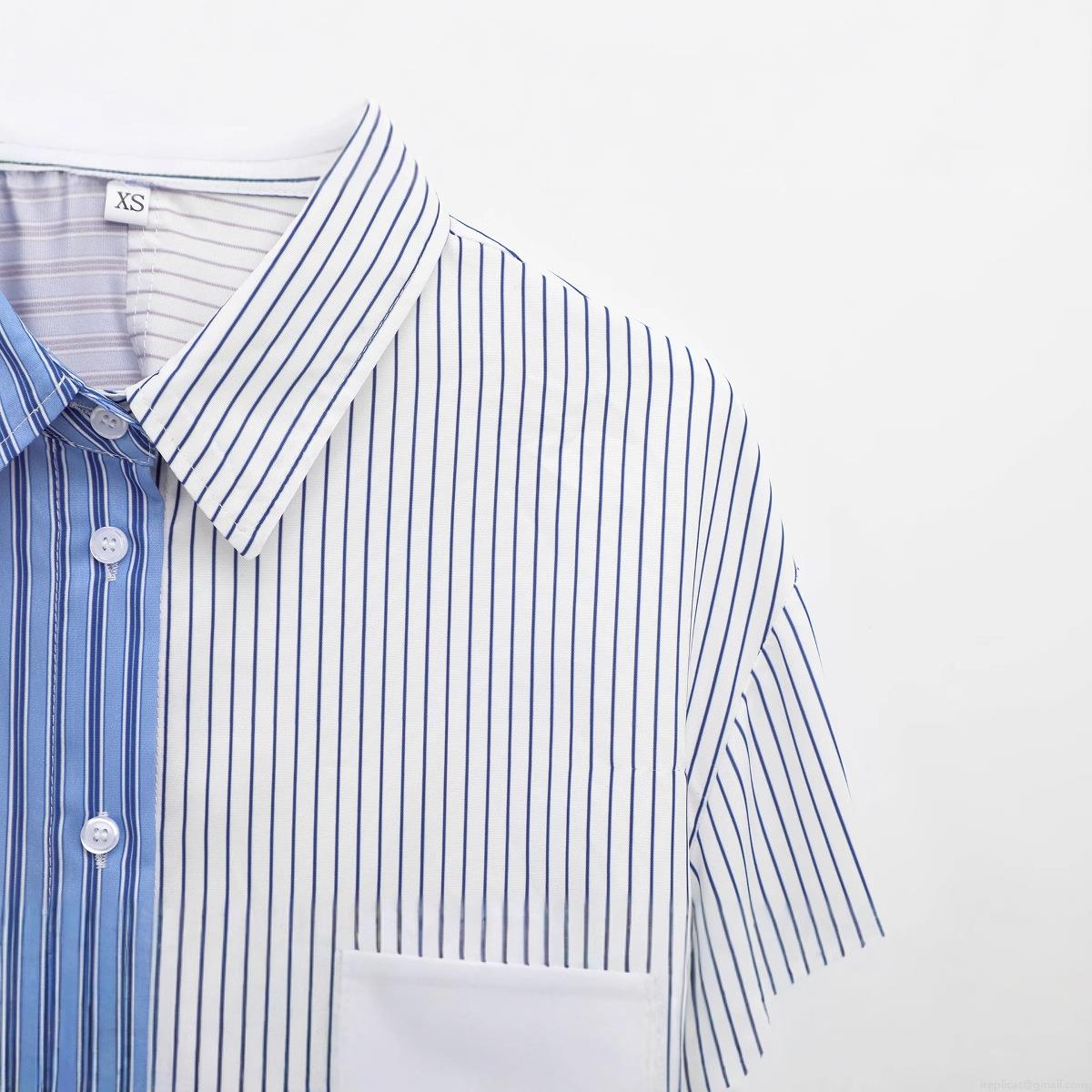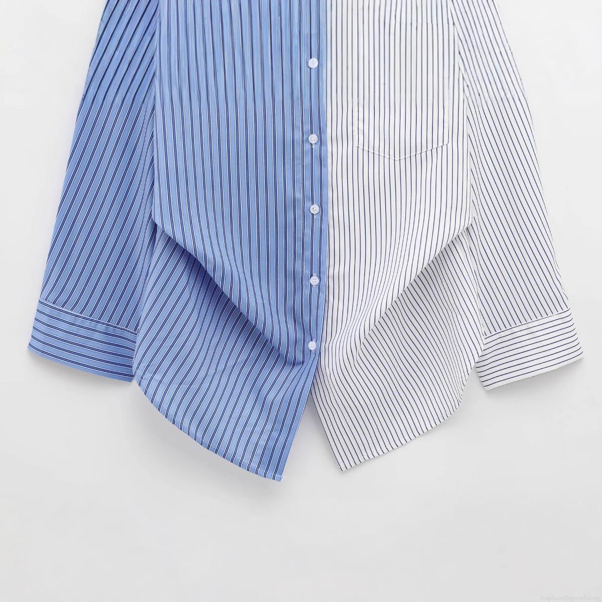 Women's Fashion Asymmetric Striped Patchwork Shirt Elegant Long Sleeve Gold Button Down Blouse Casual Office Poplin Top
