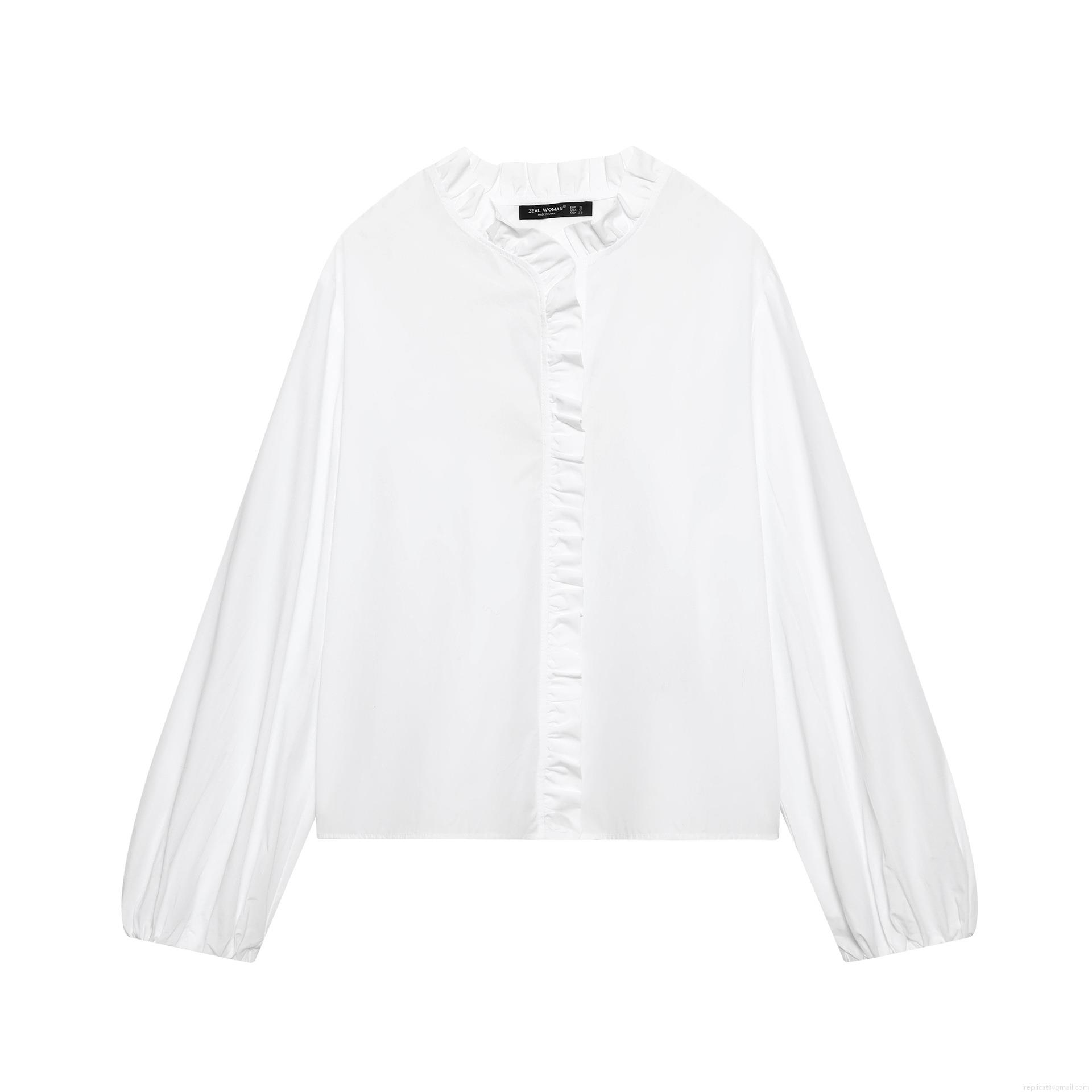 • Women's Fashion Casual Layered Ruffle Poplin Shirt 100% Polyester Lantern Sleeve Stand Collar Striped Solid Blouse Tops For Women Streetwear Chic