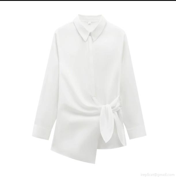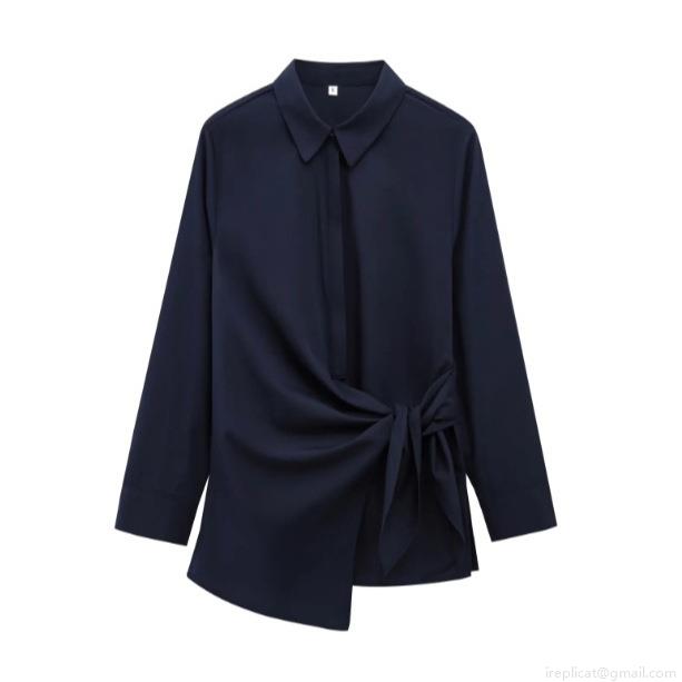 • Women's Fashion Casual Long Sleeve Poplin Shirt With Asymmetrical Tie Waist Hem Solid Color Lapel Blouse For Office Daily Lady Tops
