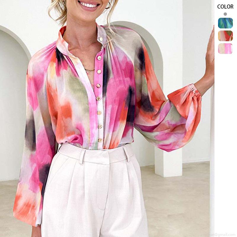 • Women's Fashion Colorful Abstract Print Polyester Chiffon Shirt Long Sleeve V-Neck Stand Collar Button Down Blouse Sexy Casual Streetwear Top for Women
