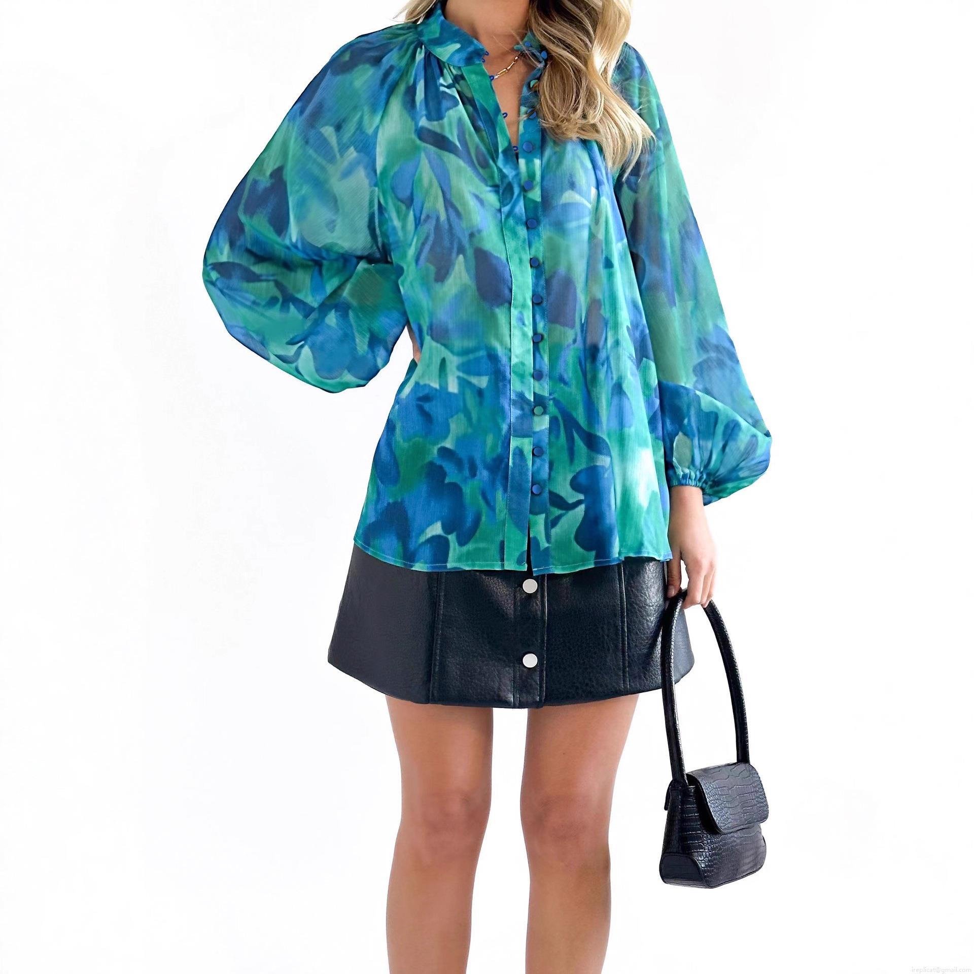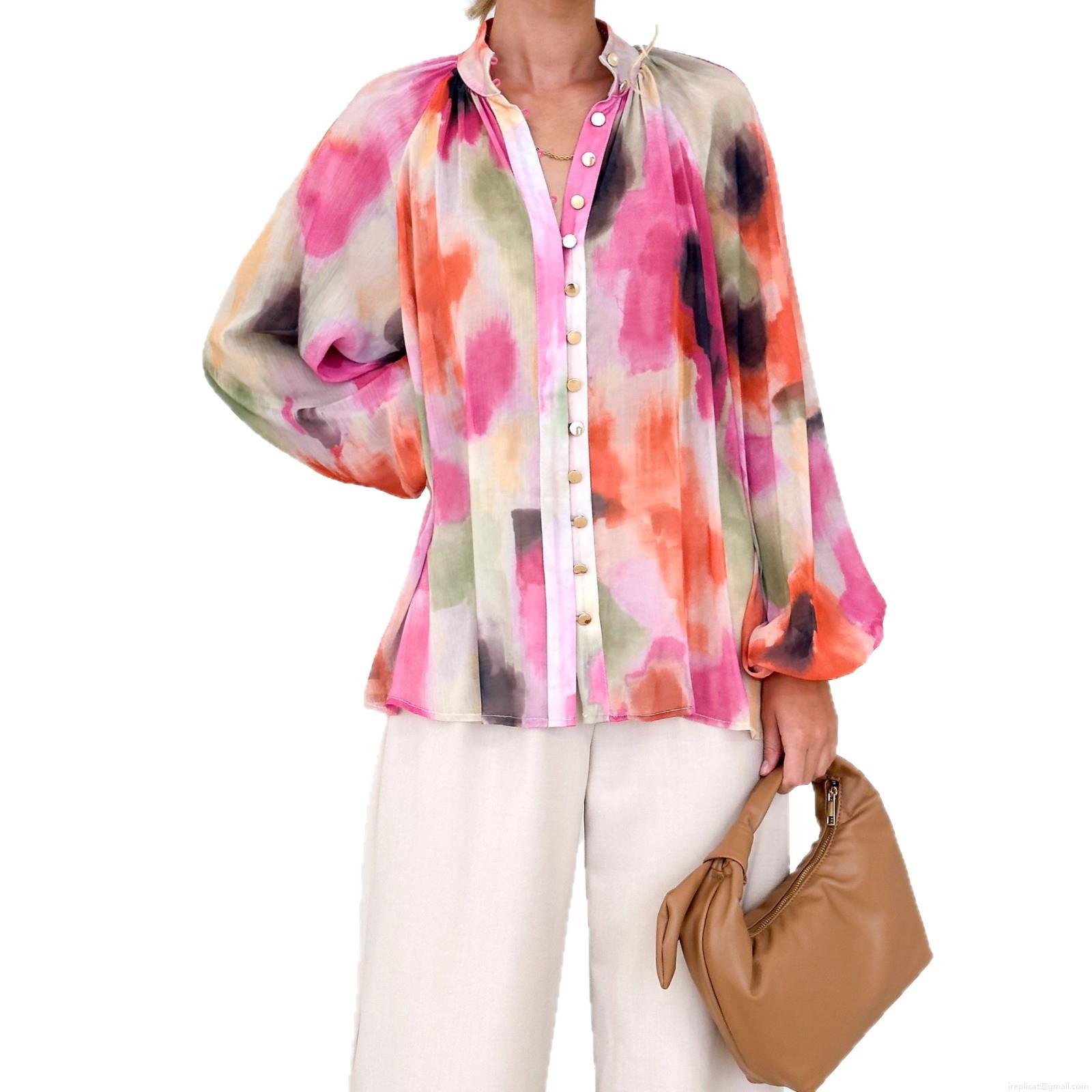 Women's Fashion Colorful Abstract Print Polyester Chiffon Shirt Long Sleeve V-Neck Stand Collar Button Down Blouse Sexy Casual Streetwear Top for Women