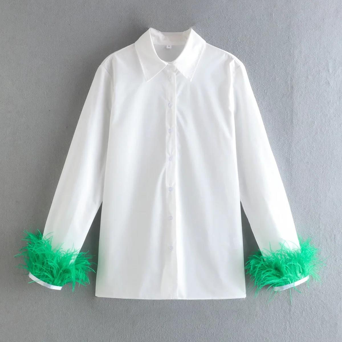 • Women's Fashion Long Sleeve Button Down Shirt With Ostrich Feather Cuffs Elegant White Commuter Blouse Polyester Cotton Patchwork Tops For Party Streetwear