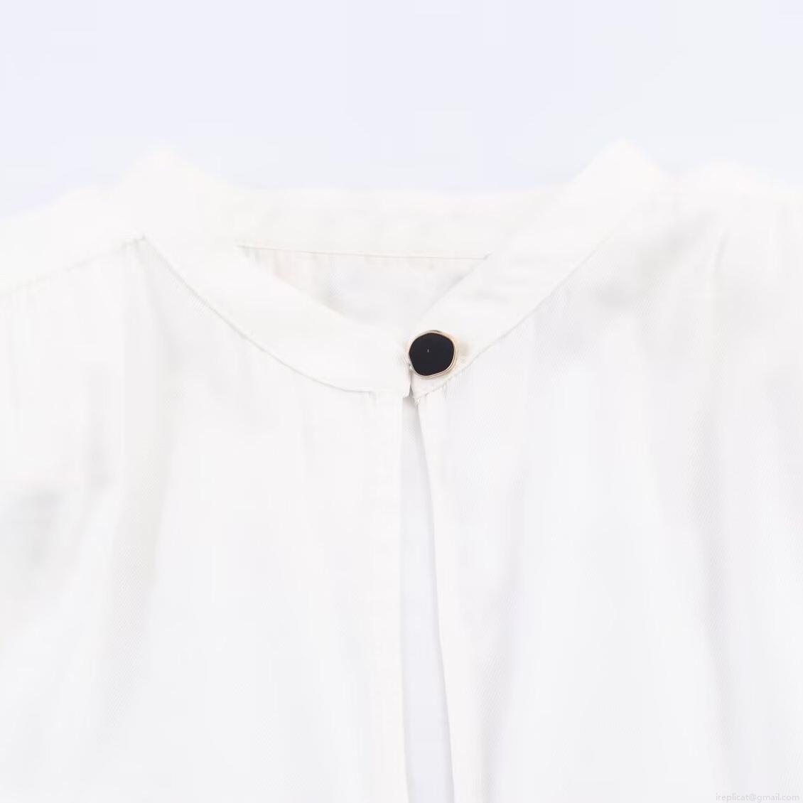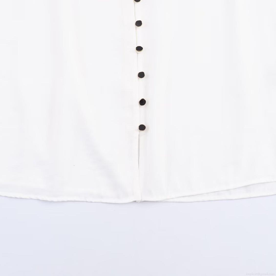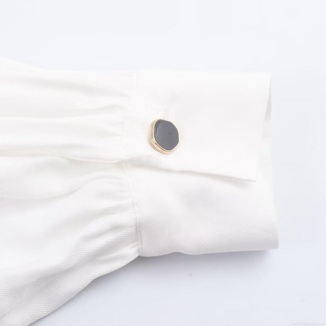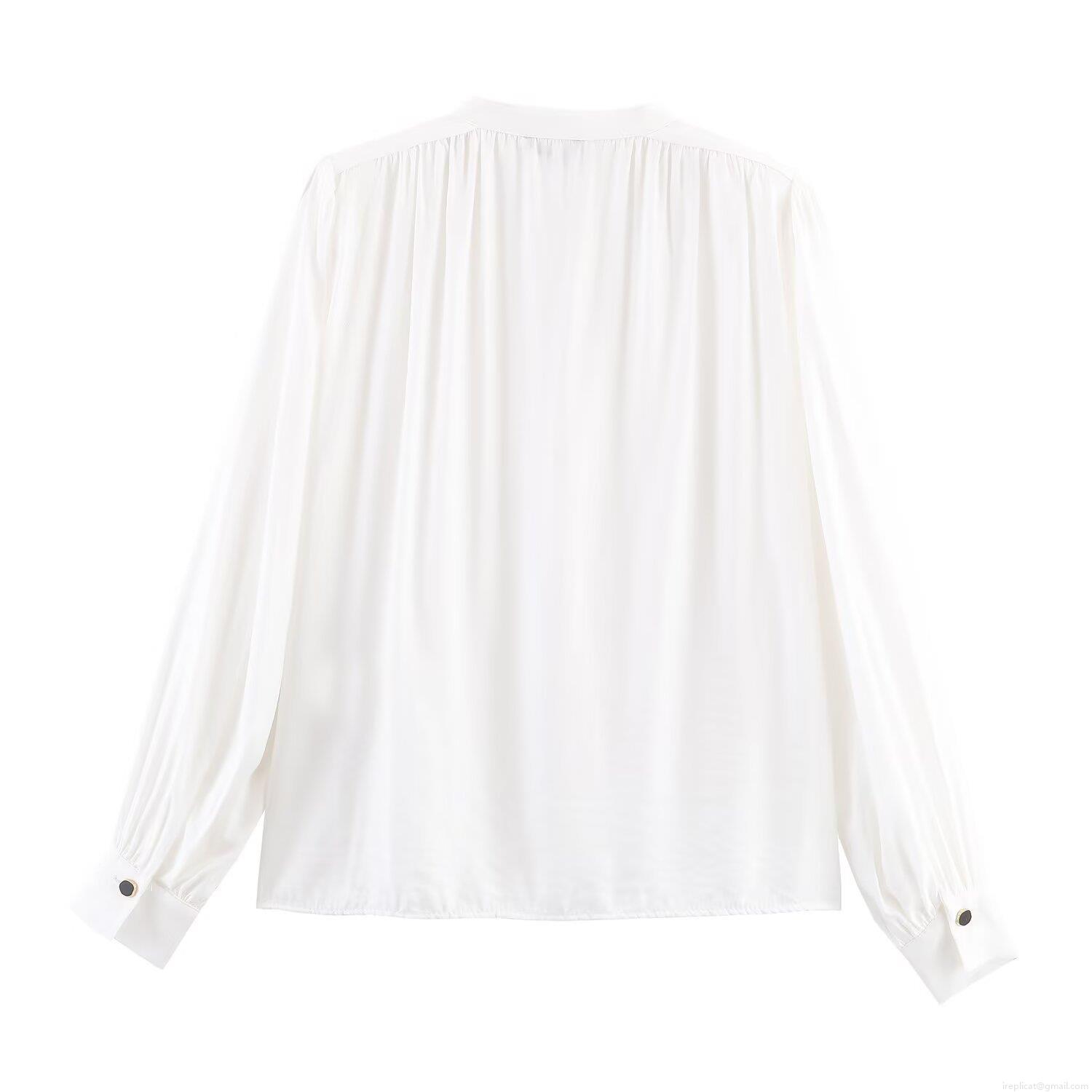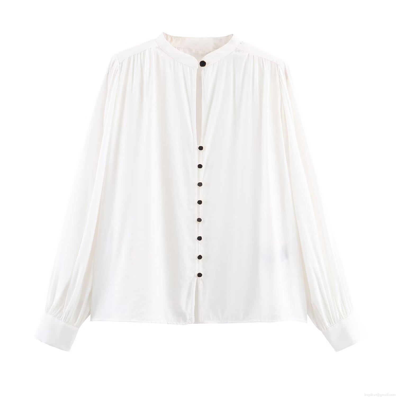 Women's Fashion Minimalist Cupro Blend Long Sleeve Blouse With Padded Shoulders Contrast Black Buttons Casual Elegant Shirt For Office Daily Wear
