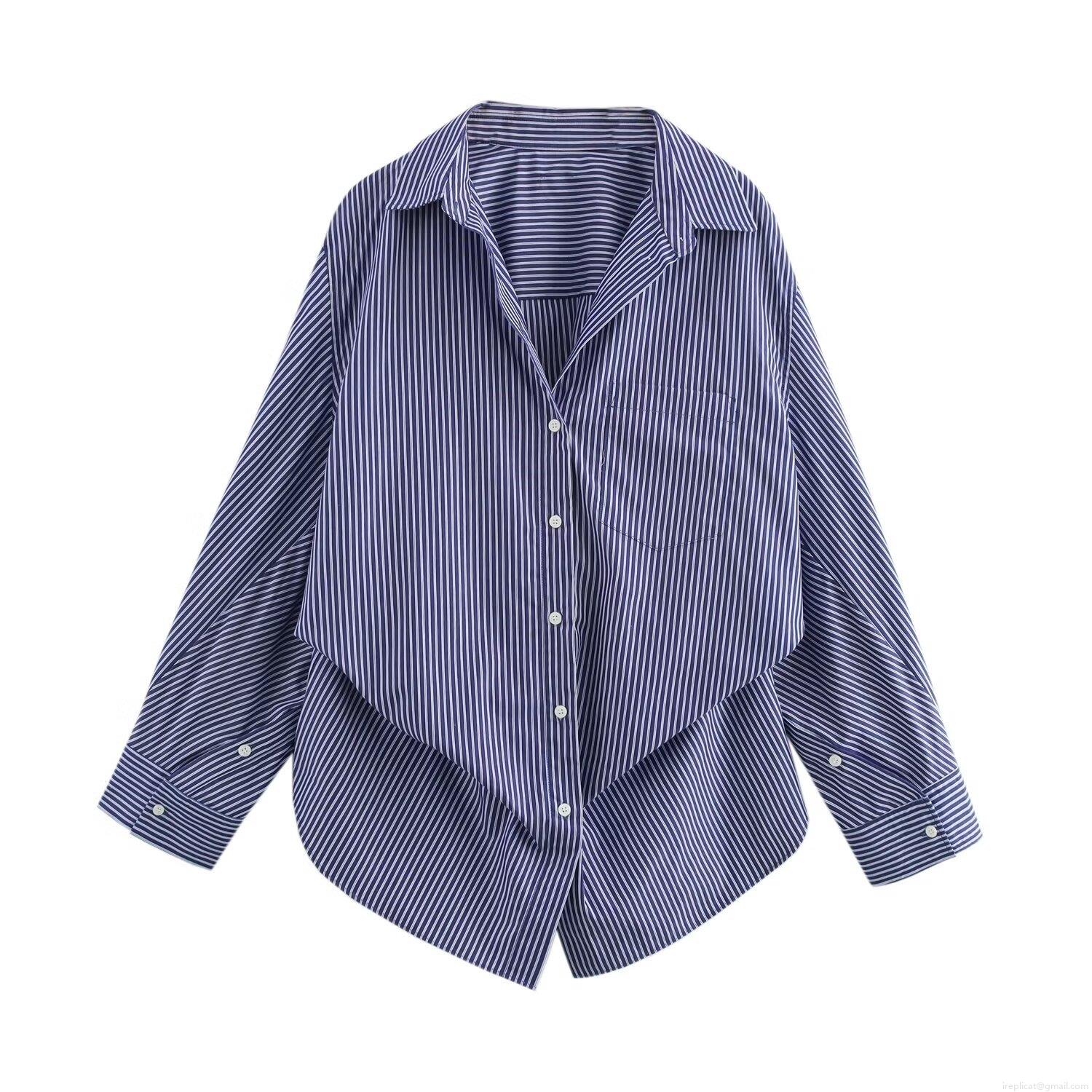 Irregular Hem, Horizontal Stripe Patchwork, Rear Split, Chest Pocket
