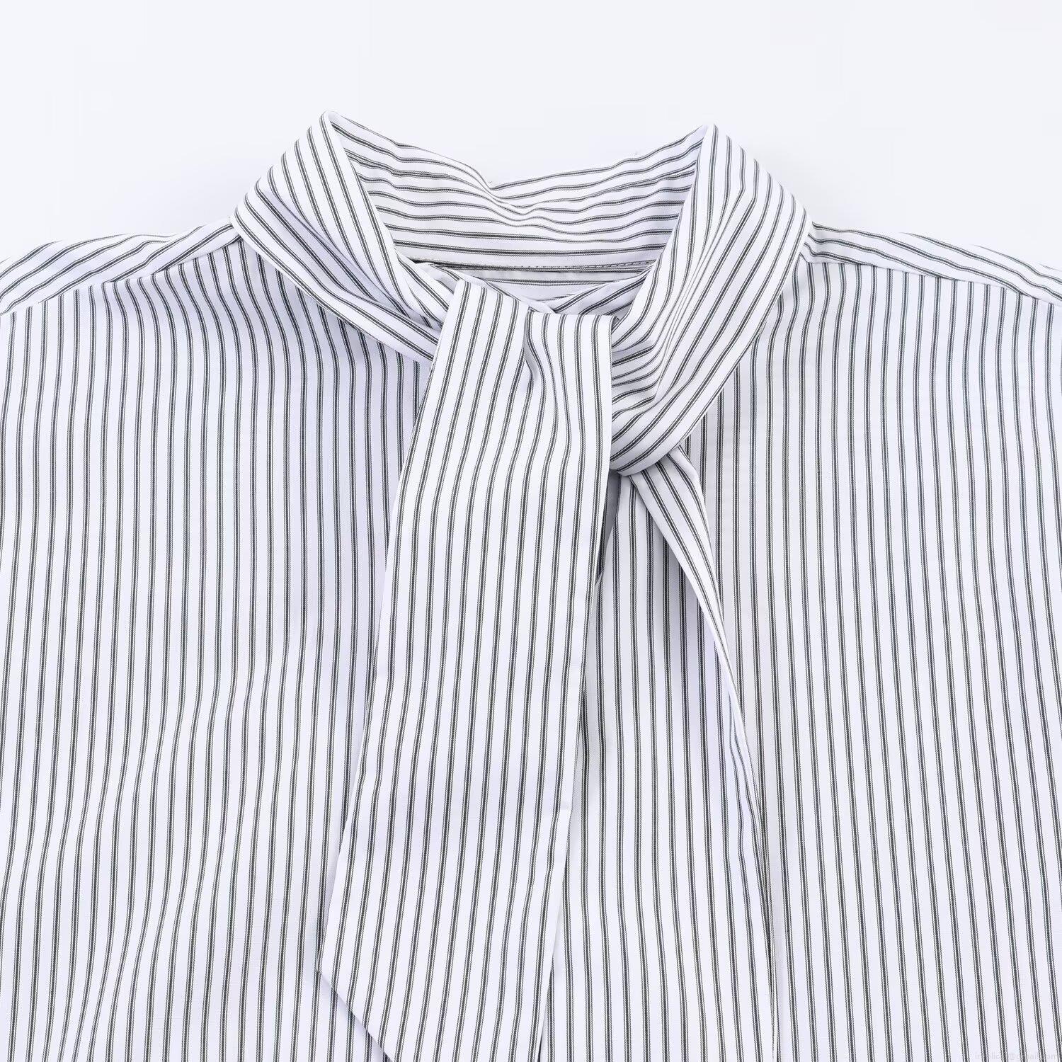 Women's Fashion Striped Poplin Shirt Scarf Tie Neck Long Sleeve Blouse Casual Office Work Button Down Tops Sweet Streetwear Ladies Clothing