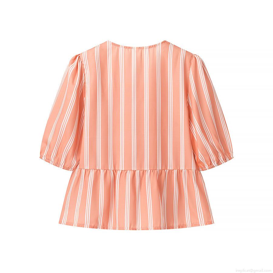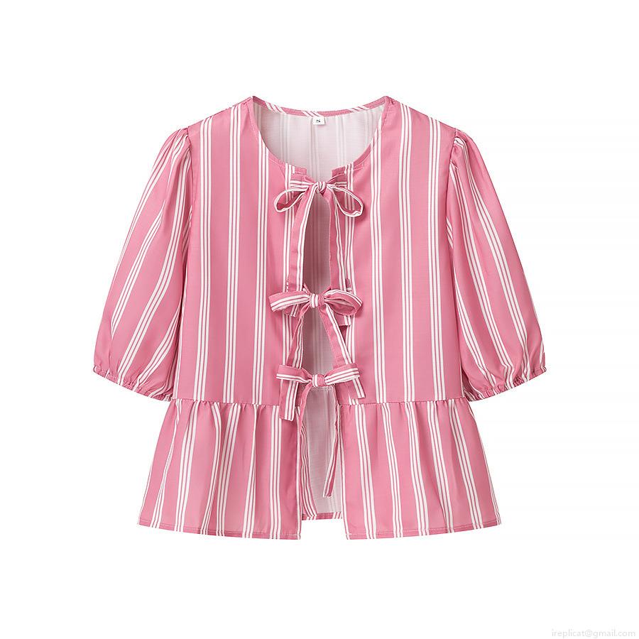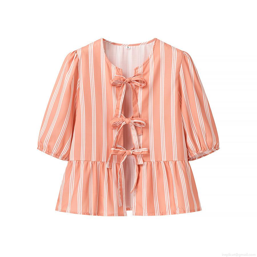 • Women's Fashion Vertical Striped Blouse Bow Tie Front Round Neck Half Sleeve Peplum Hem Summer Tops Streetwear Casual Shirt