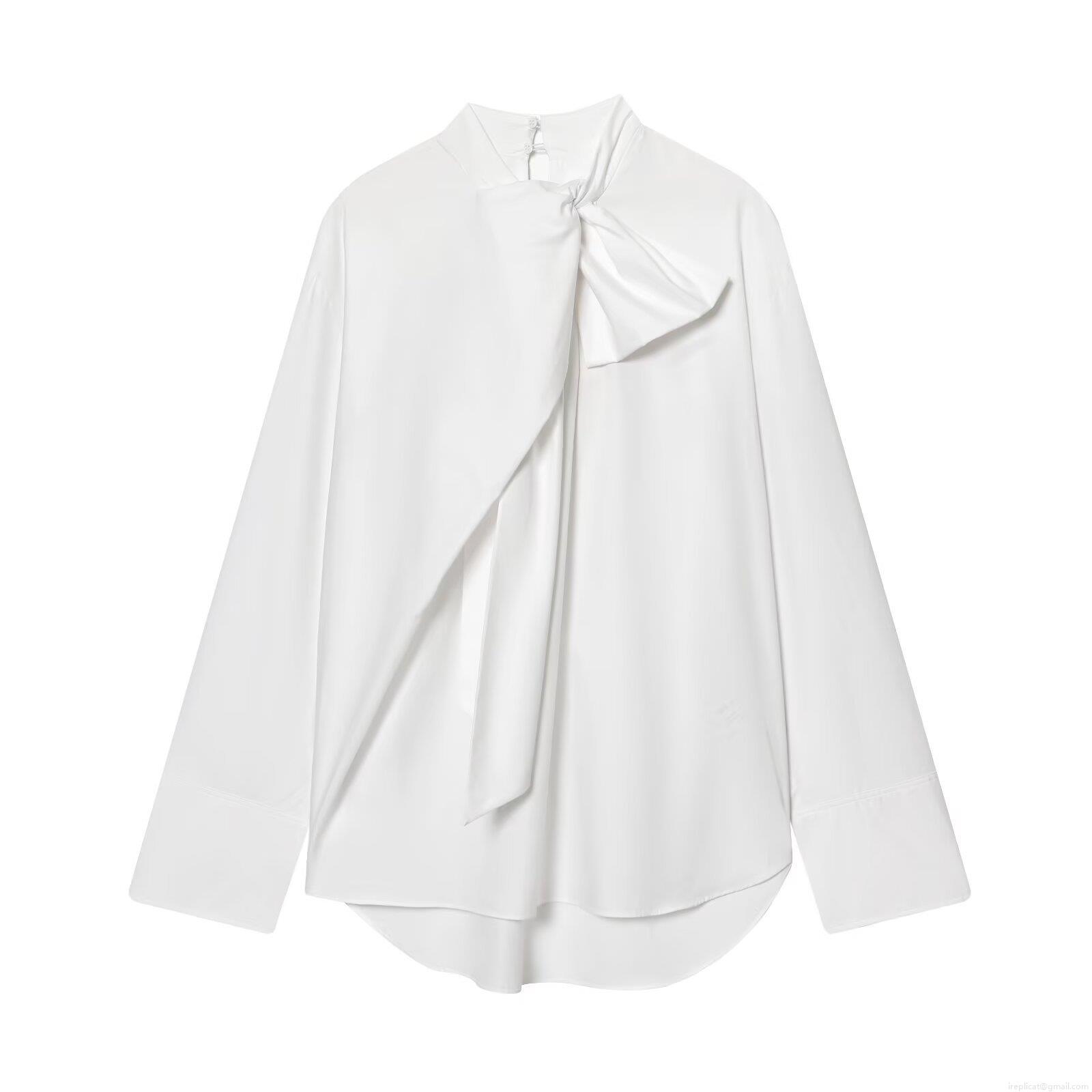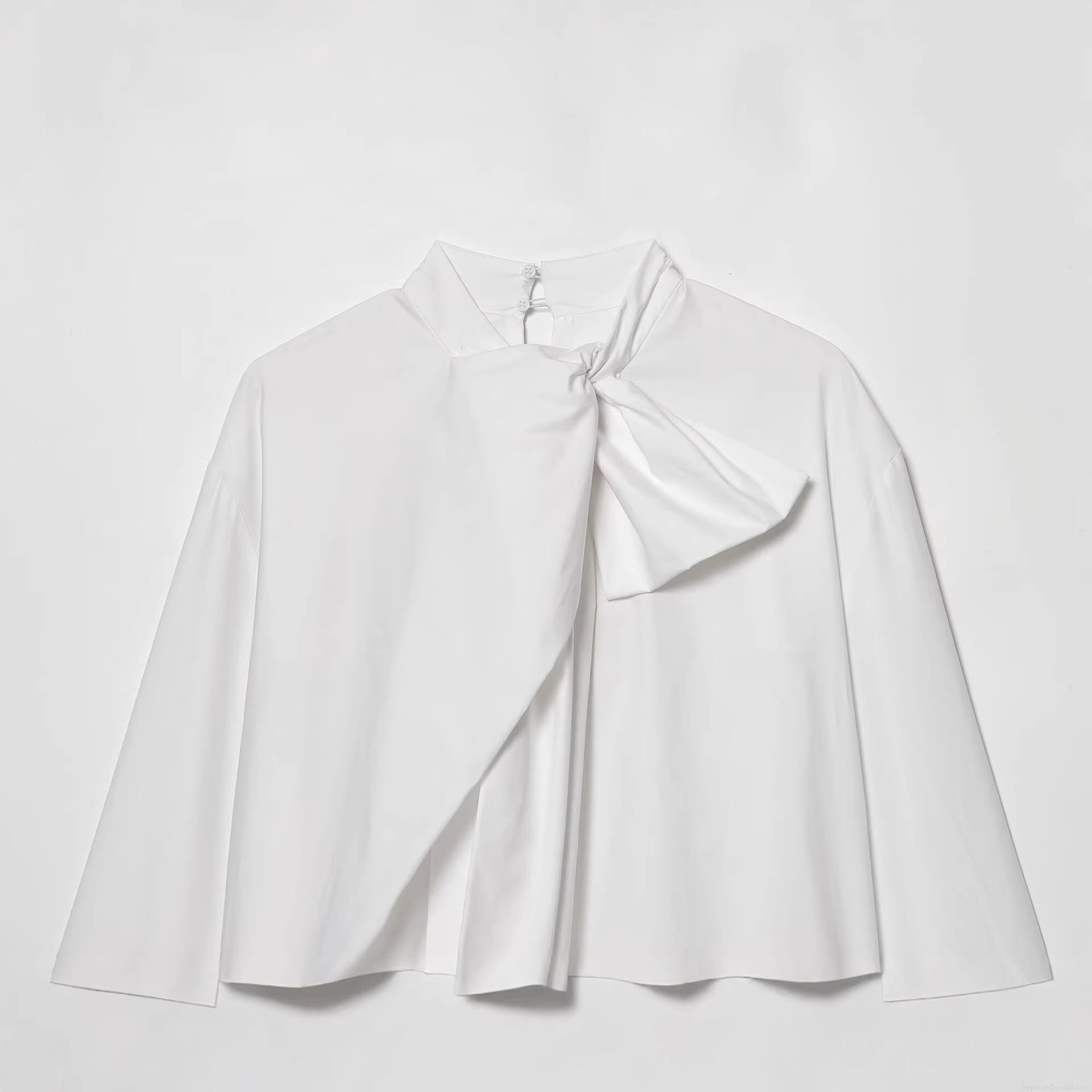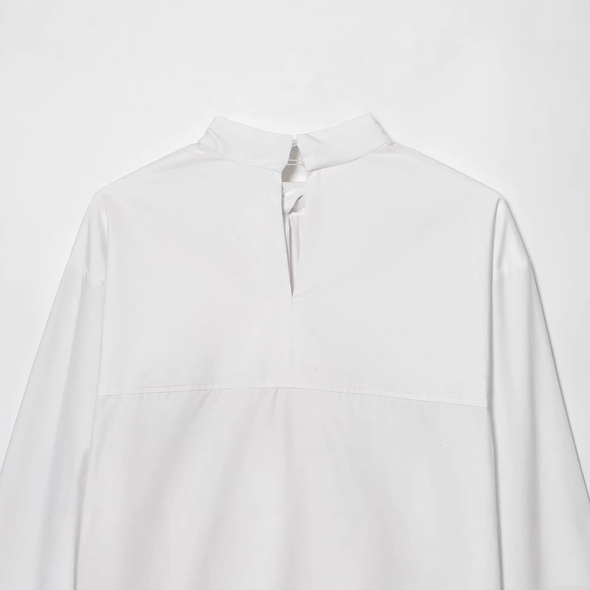 • Women's Fashion White Poplin Blouse Featuring Oversized Bow Tie Design Stand Collar Loose Fit Long Sleeve Casual Streetwear Pullover Shirt Top
