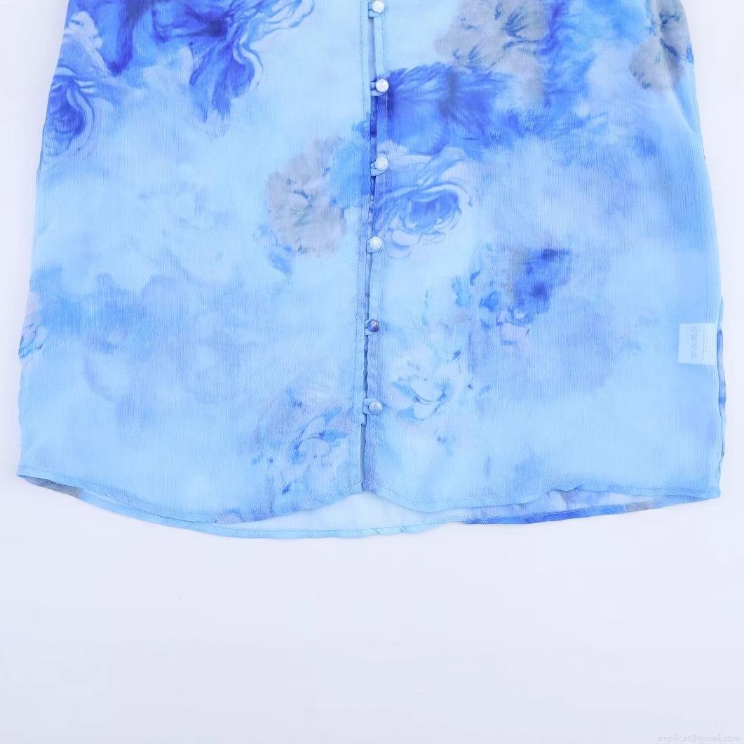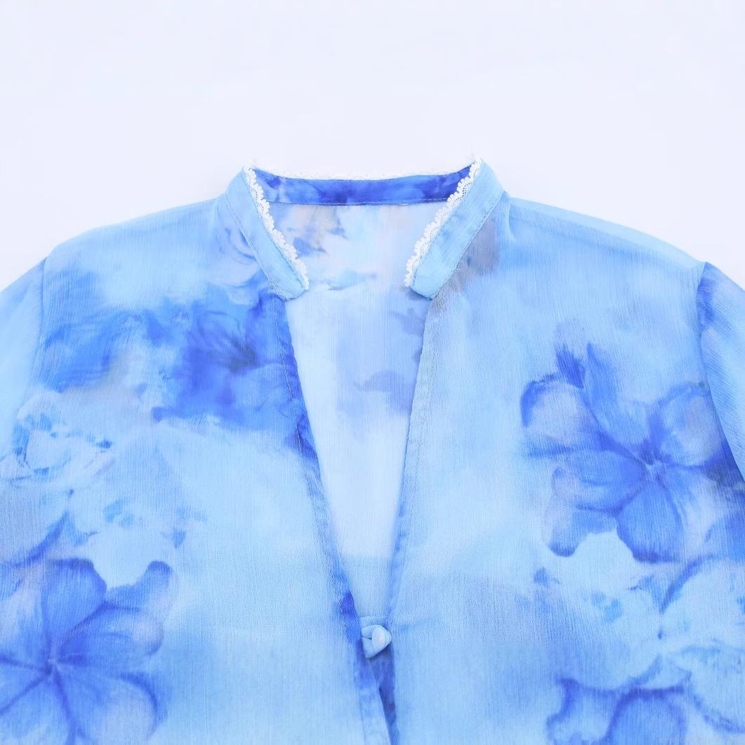 Floral Pattern, Flowers, V-neck, Buckle, Lace Patchwork, Lantern Sleeves