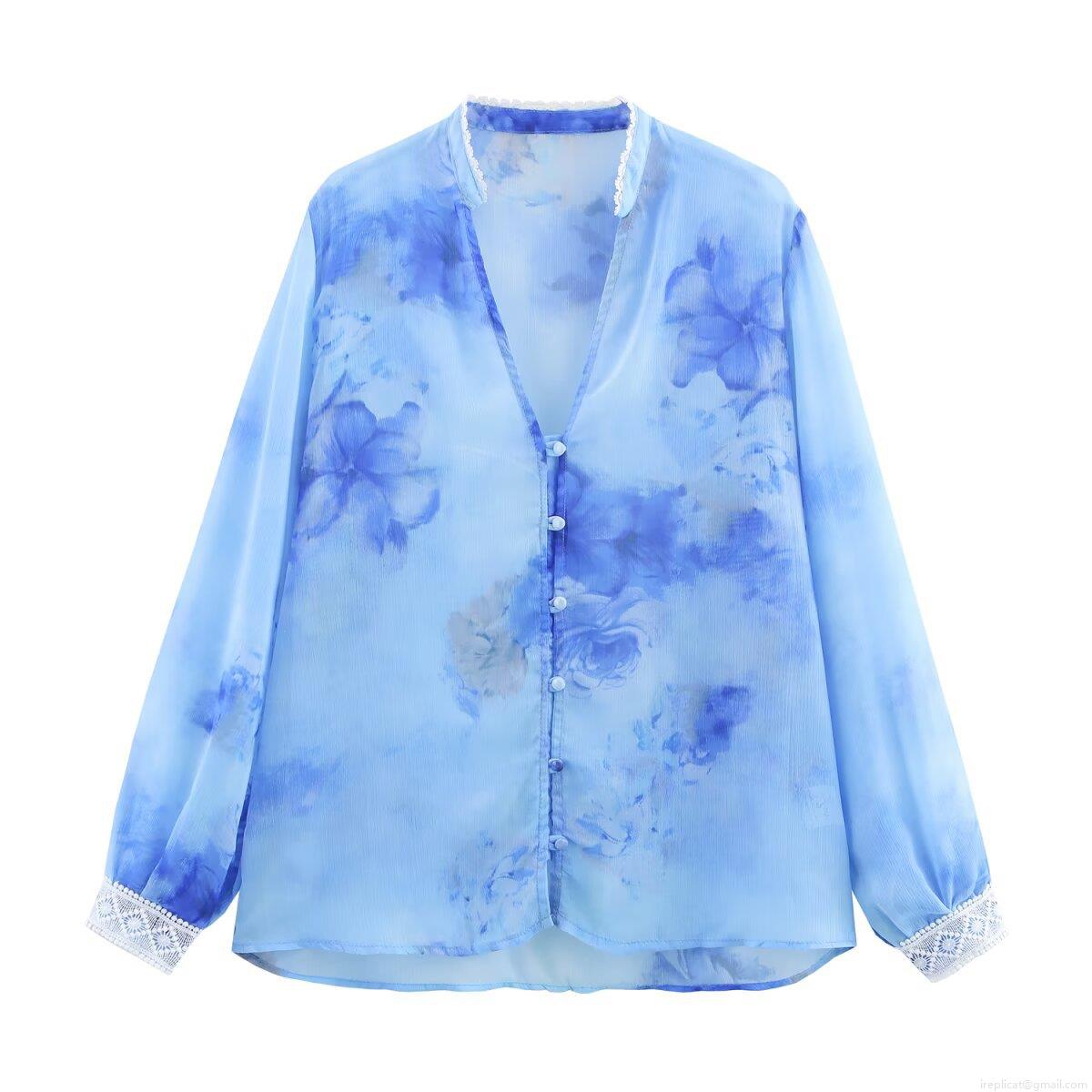 Women's Floral Chiffon Blouse Elegant V Neck Lace Patchwork Lantern Sleeve Shirt Casual Long Sleeve Top For Women