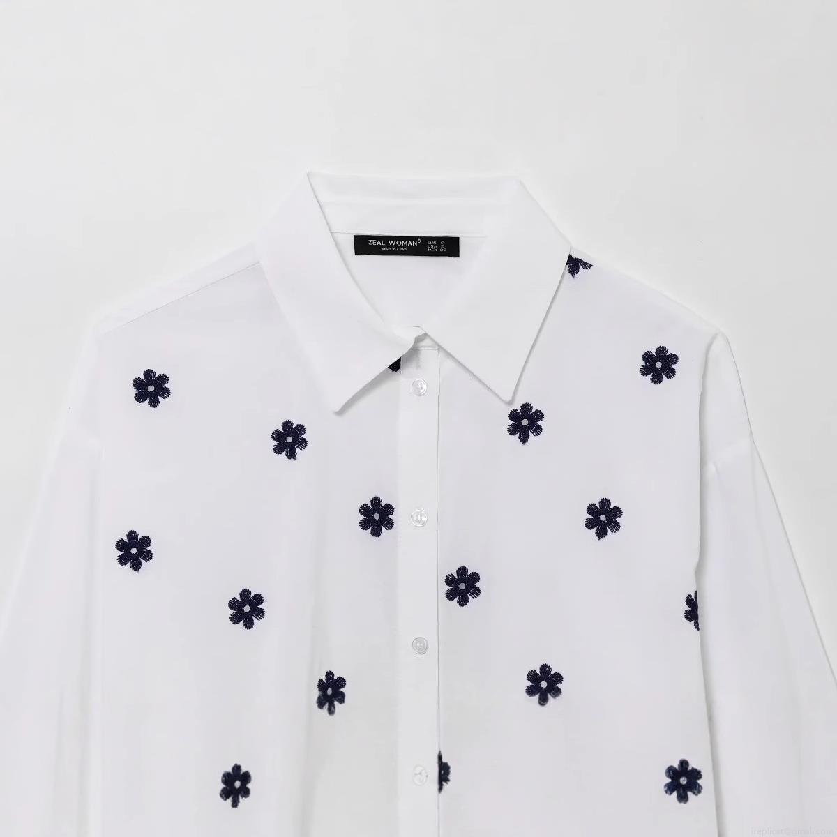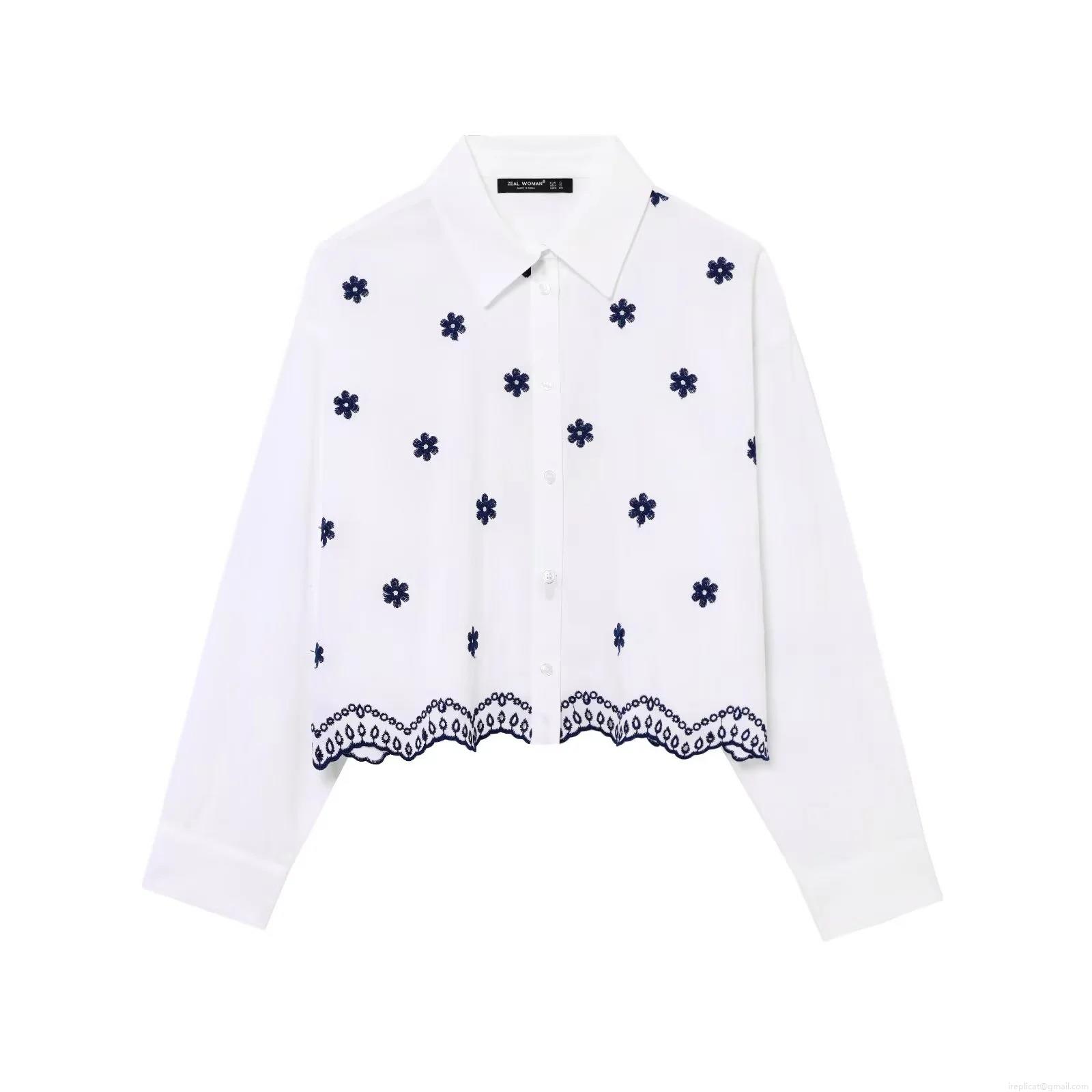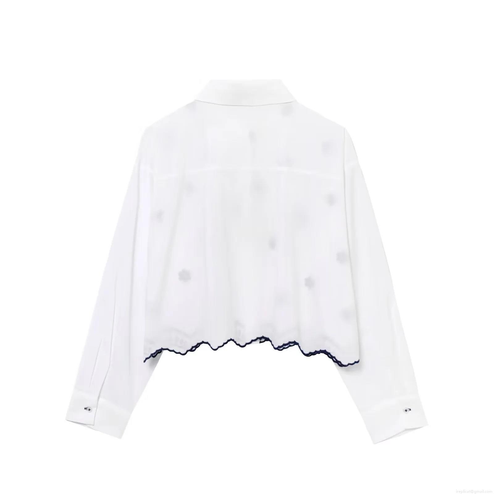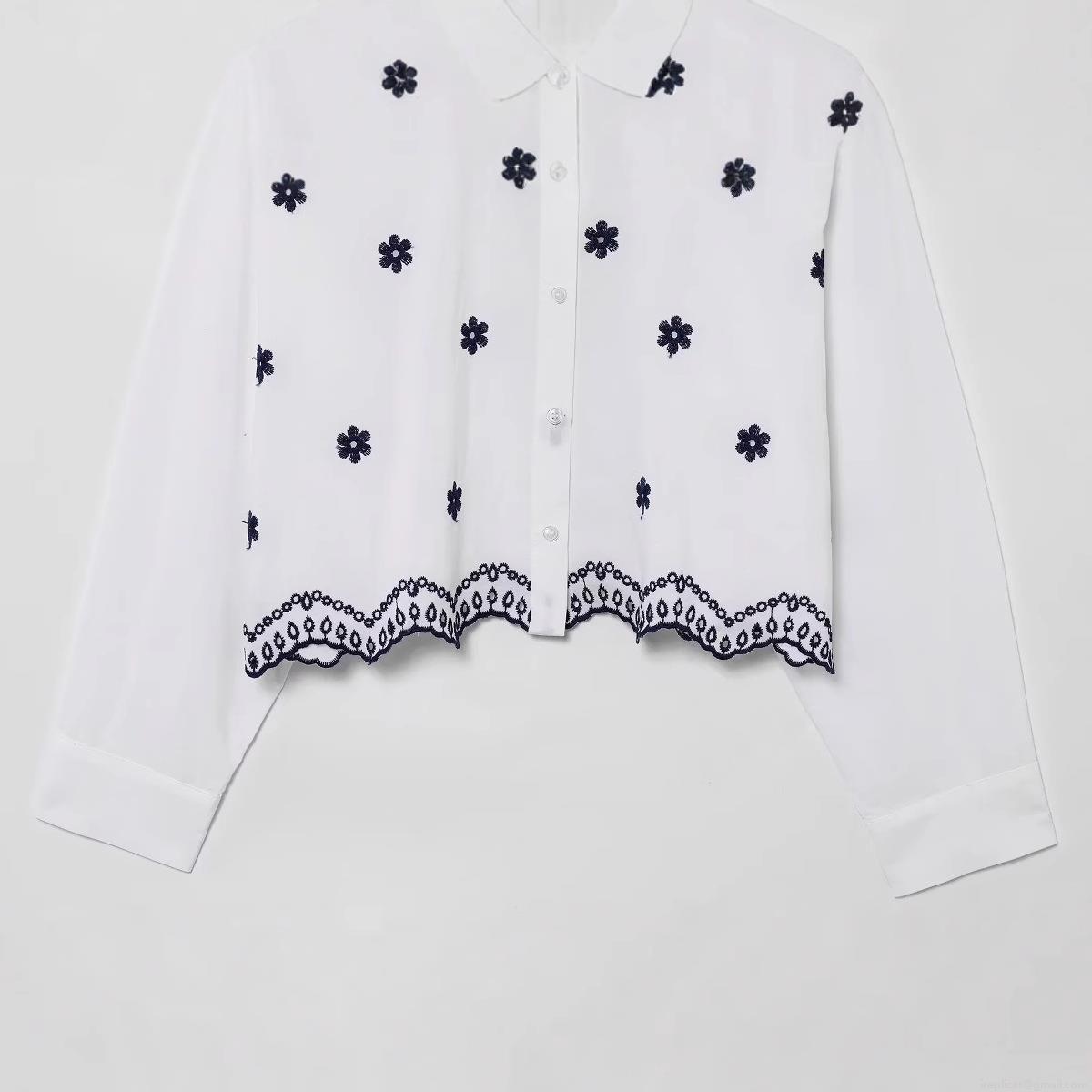 Women's Floral Embroidered Poplin Shirt 100% Polyester Long Sleeve Button Down Blouse with Scalloped Hollow Hem Casual Fashion Tops for Women