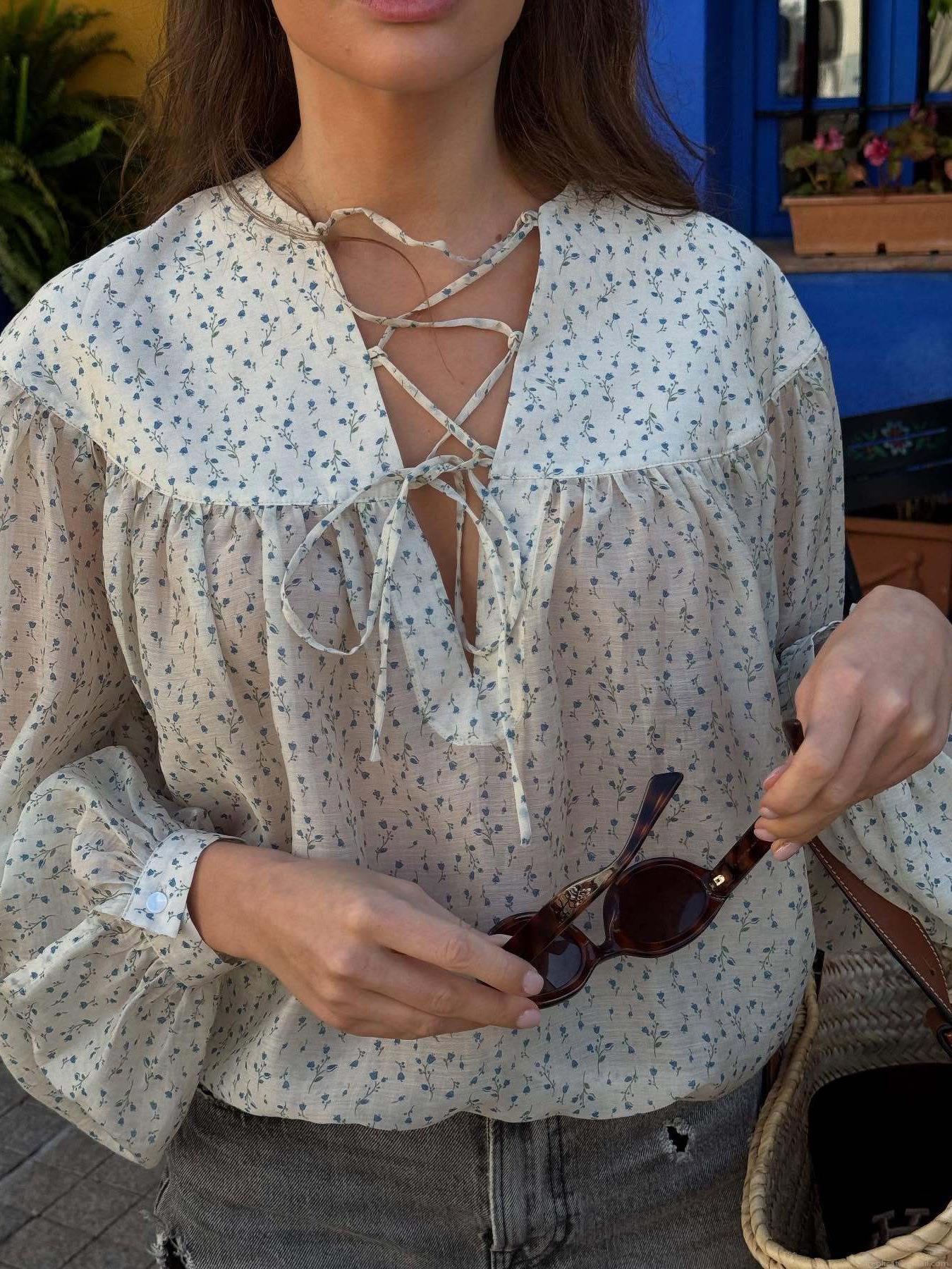• Women's Floral Print Blouse Linen Blend V Neck Lace Up Top Bohemian Vacation Long Lantern Sleeve White Blue Floral Shirt for Women
