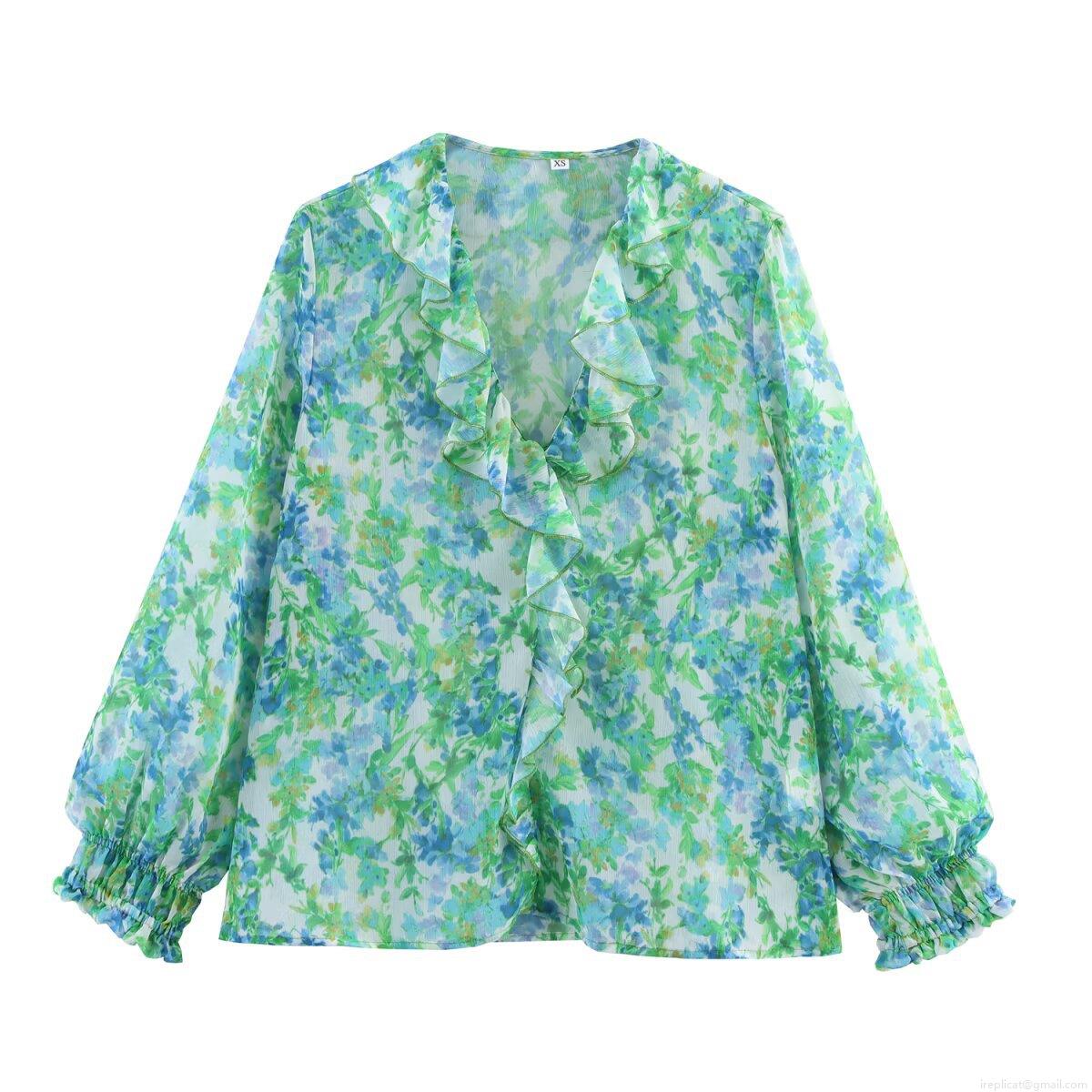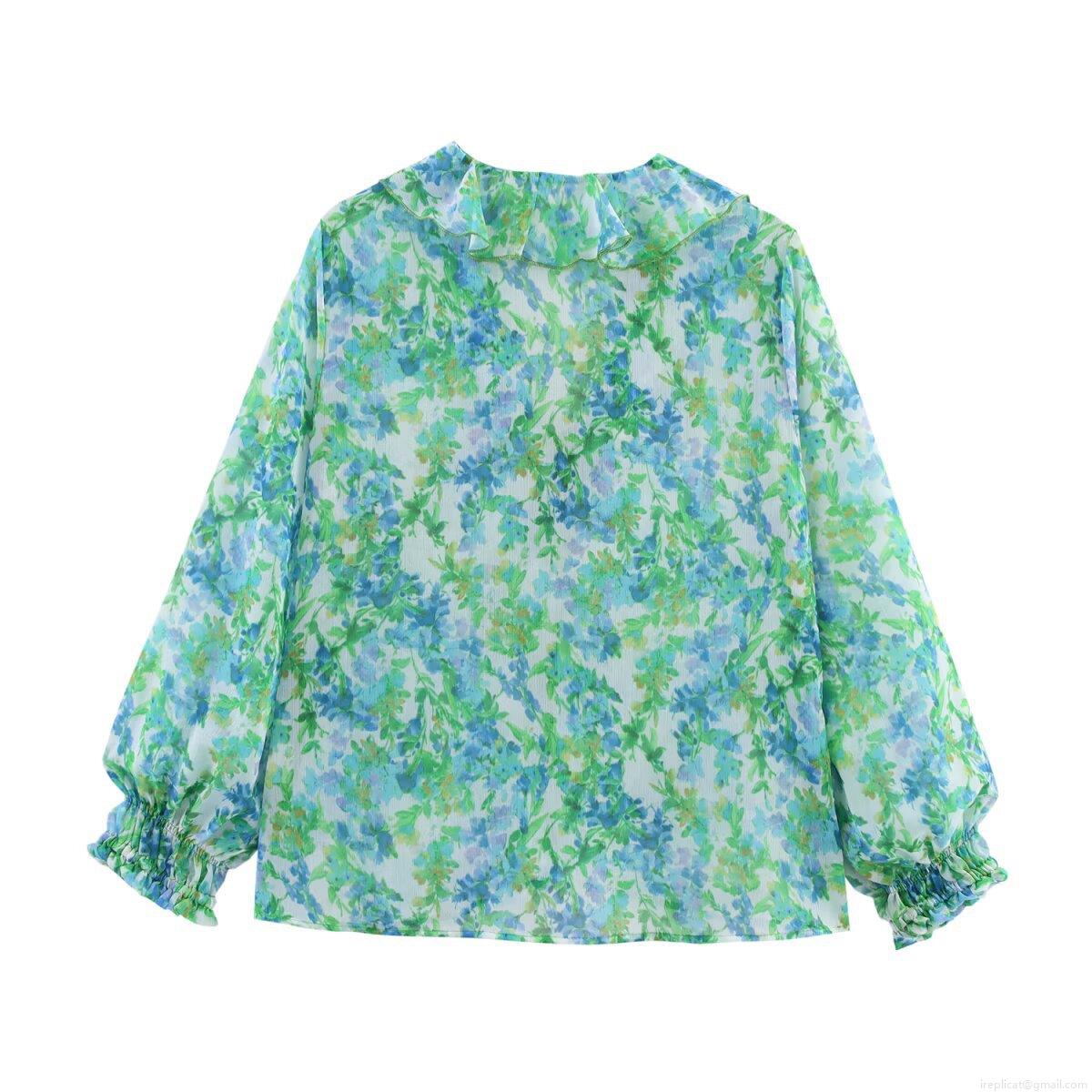 • Women's Floral Print Chiffon Blouse Elegant Ruffle Trim Long Sleeve Pullover Top For Casual Daily Wear Sweet Style Lady Shirt