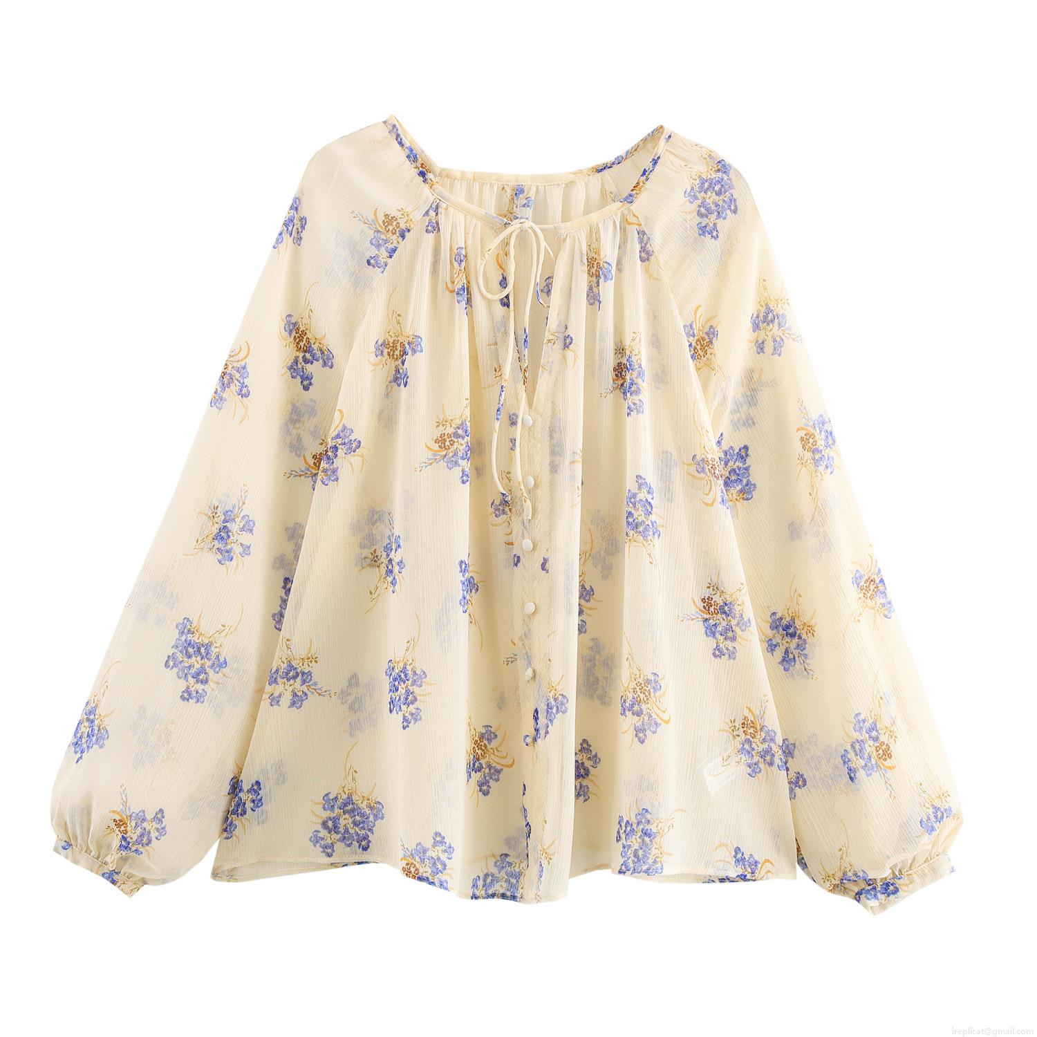 • Women's Floral Print Chiffon Blouse Long Lantern Sleeve Round Neck Tie-Up Top Sweet Casual Loose Polyester Shirt For Spring Autumn Women Clothing