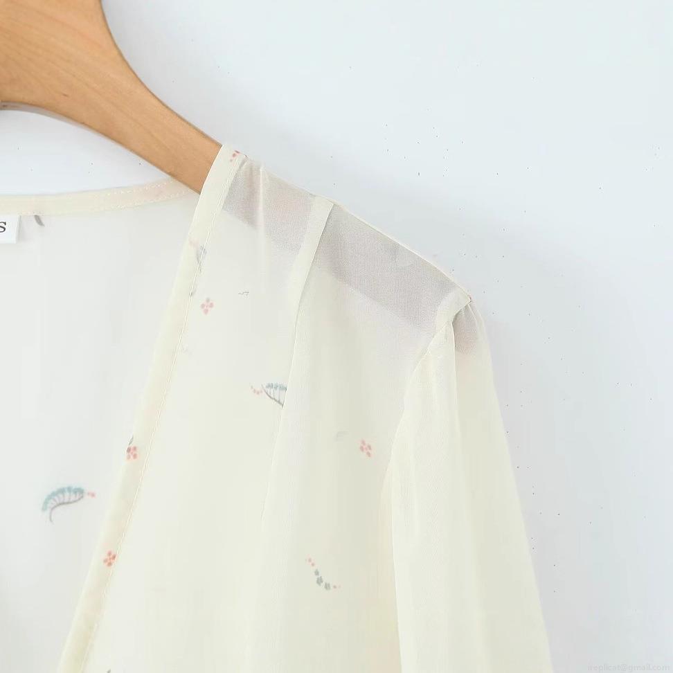 Women's Floral Print Chiffon Blouse V Neck Flared Sleeve Slim Fit Waist Cinching Long Sleeve Shirt Top Elegant Casual Streetwear Office Lady Cream White