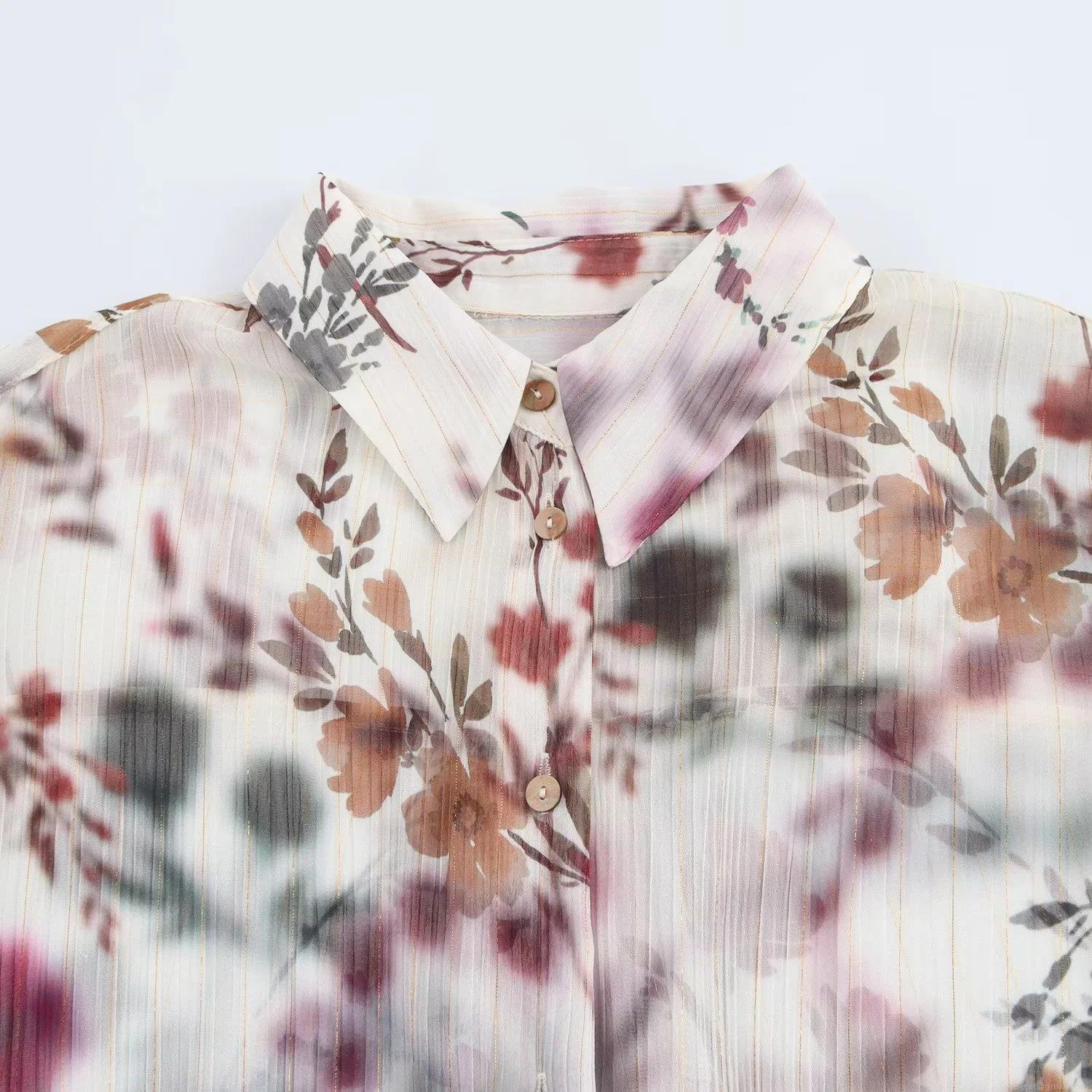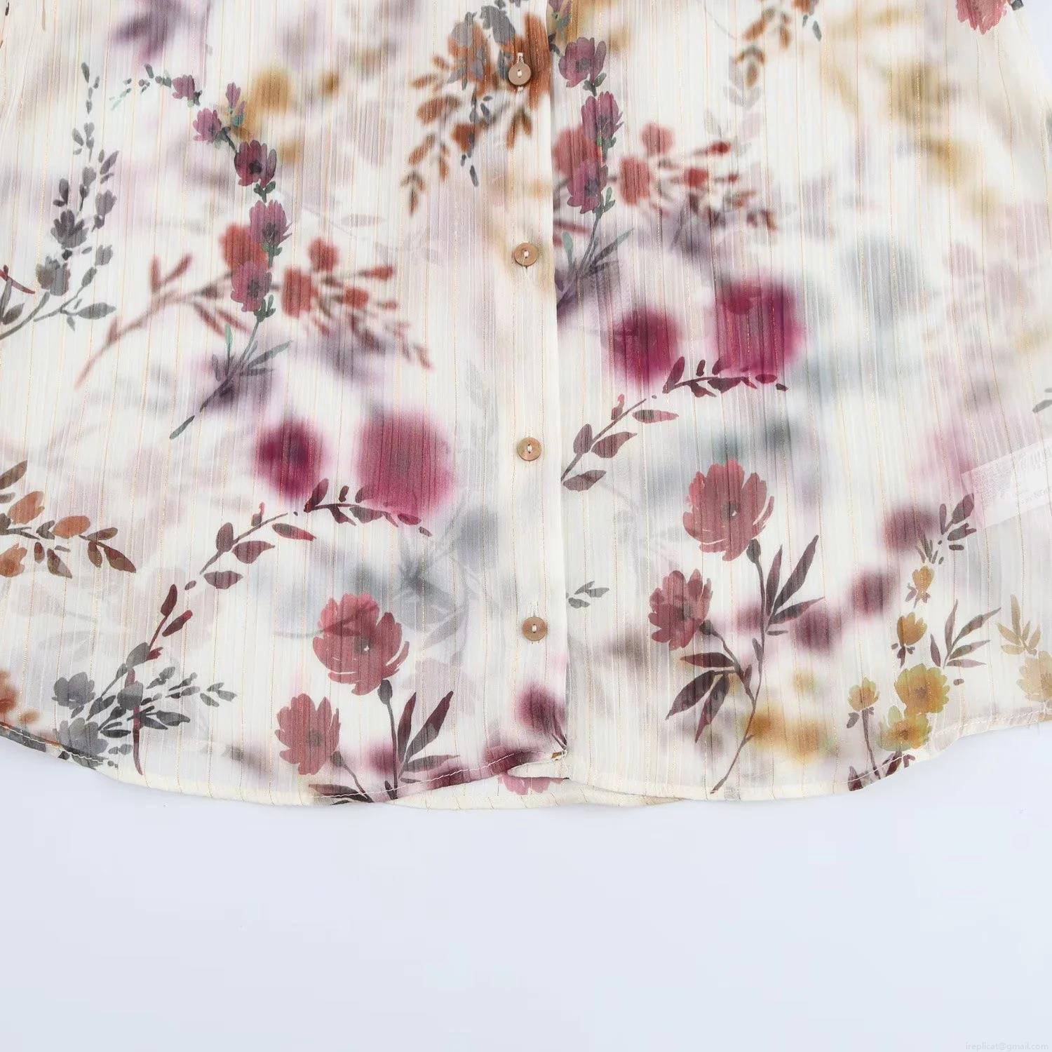 • Women's Floral Print Chiffon Shirt With Metallic Gold Stripes Ruffle Flared Cuffs Long Sleeve Lapel Button Down Blouse Casual Elegant Office Tops