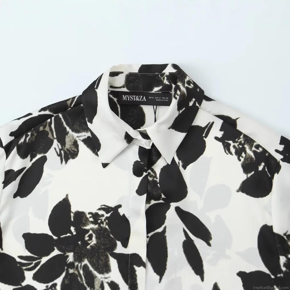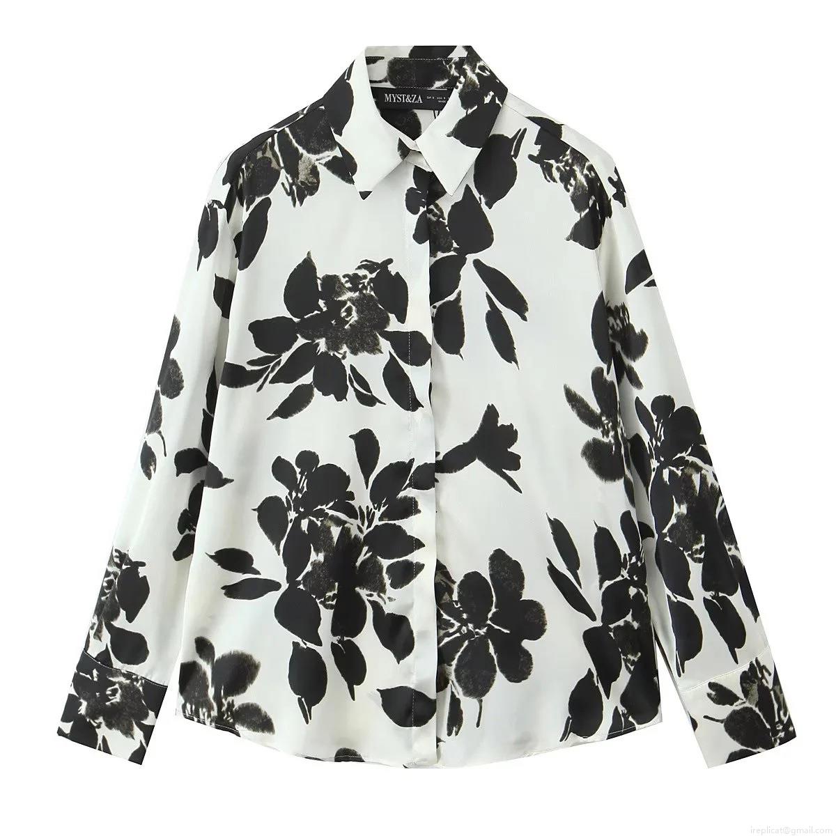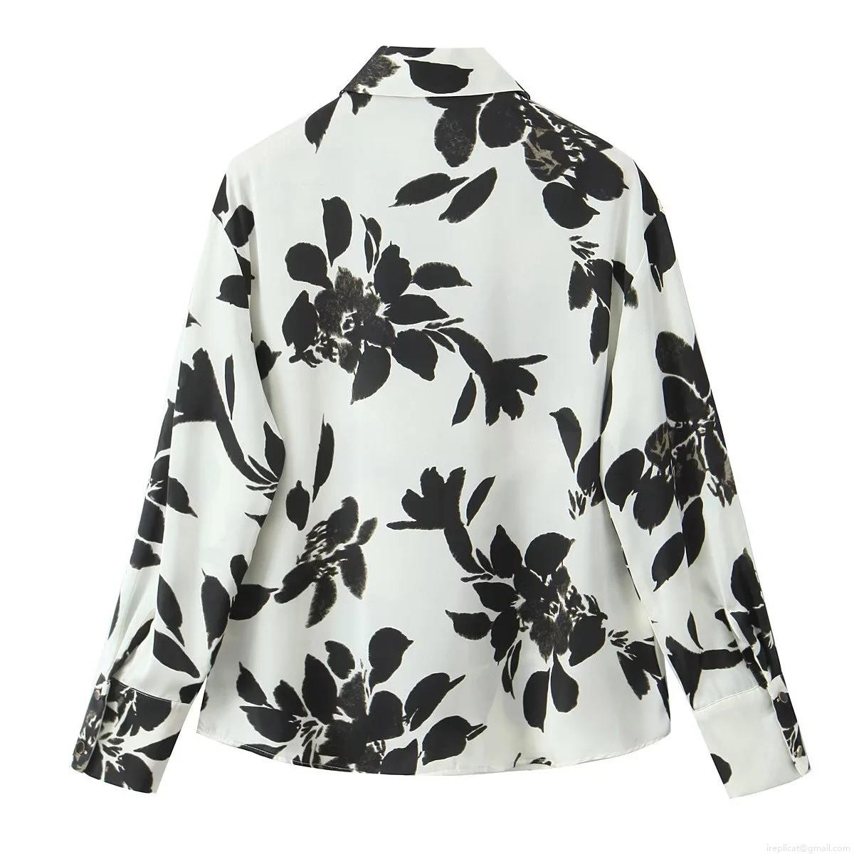 • Women's Floral Print Long Sleeve Button Down Shirt Satin Texture Elegant Lapel Blouse White Base Black Flower Pattern Chic Casual Top