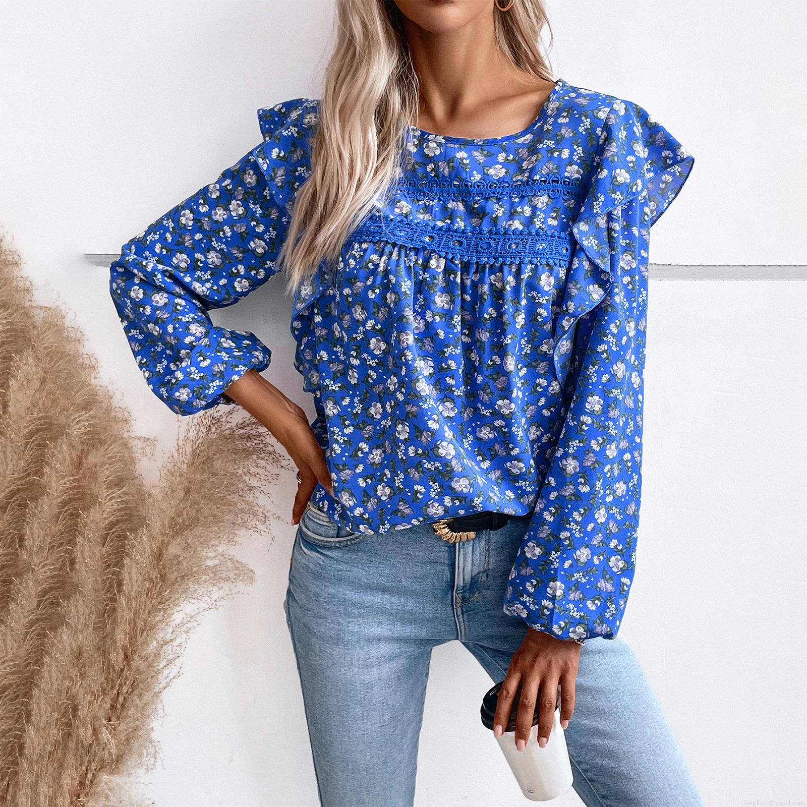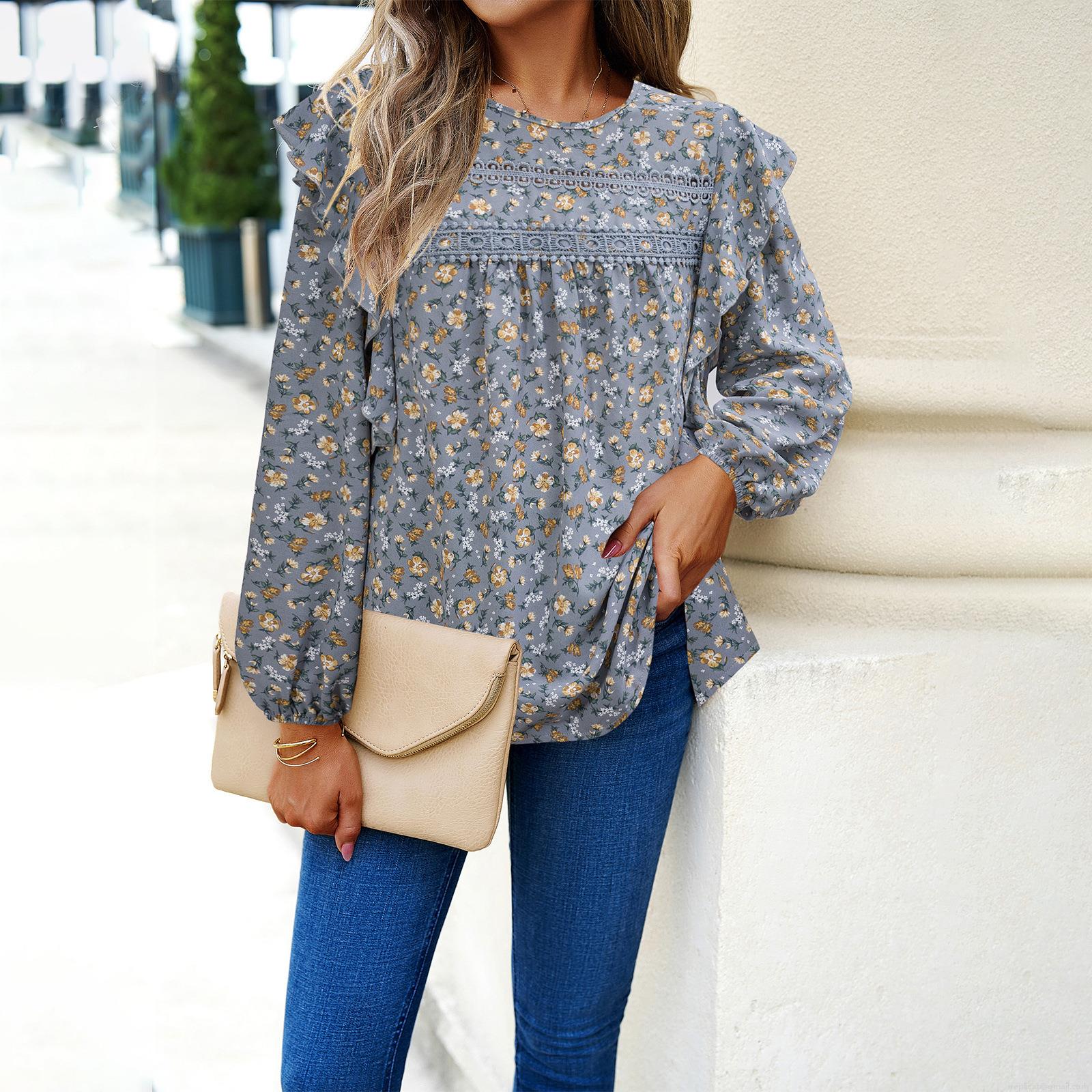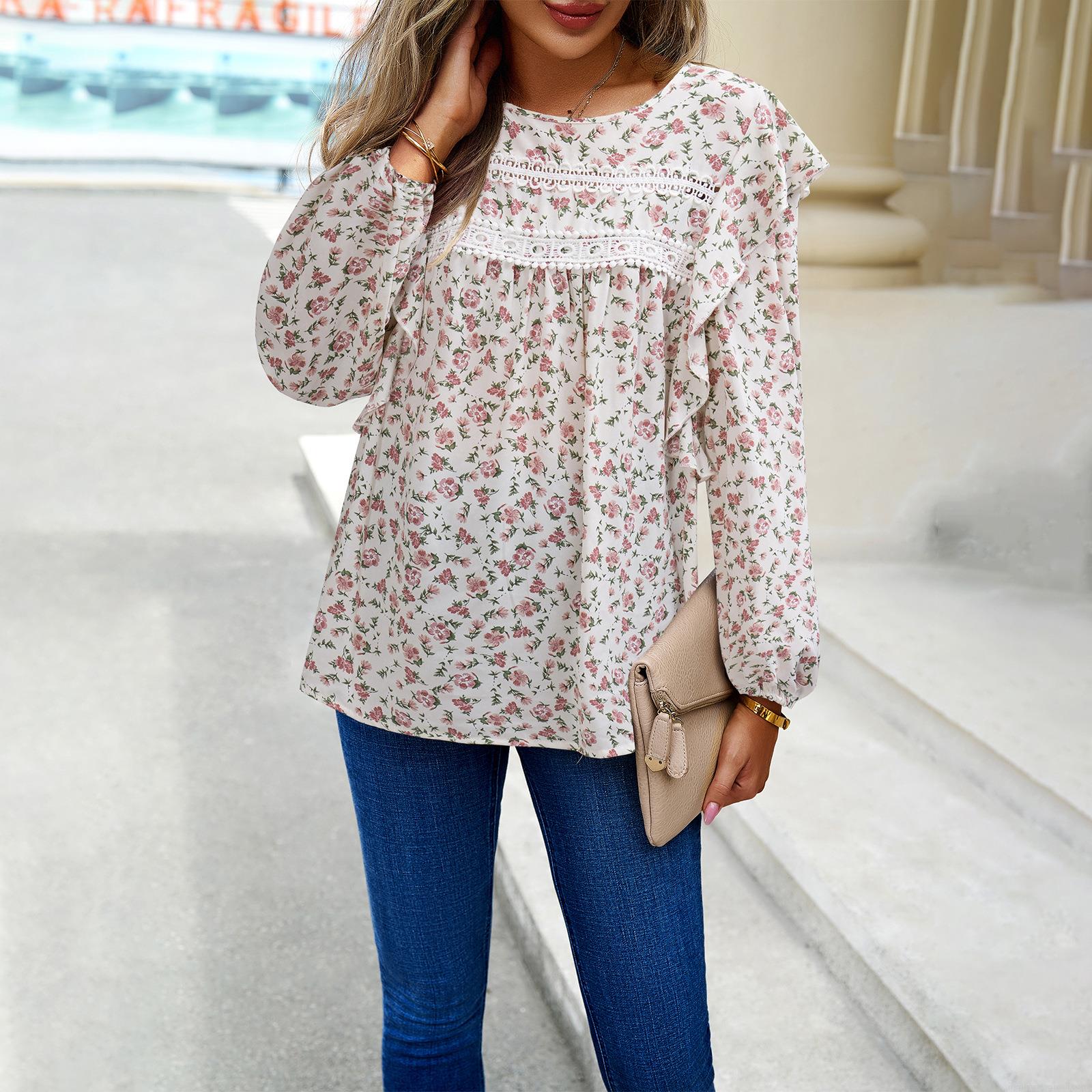 • Women's Floral Print Long Sleeve Chiffon Blouse With Lace Patchwork Ruffle Trim Round Neck Loose Casual T-Shirt Tops For Autumn Women Clothing