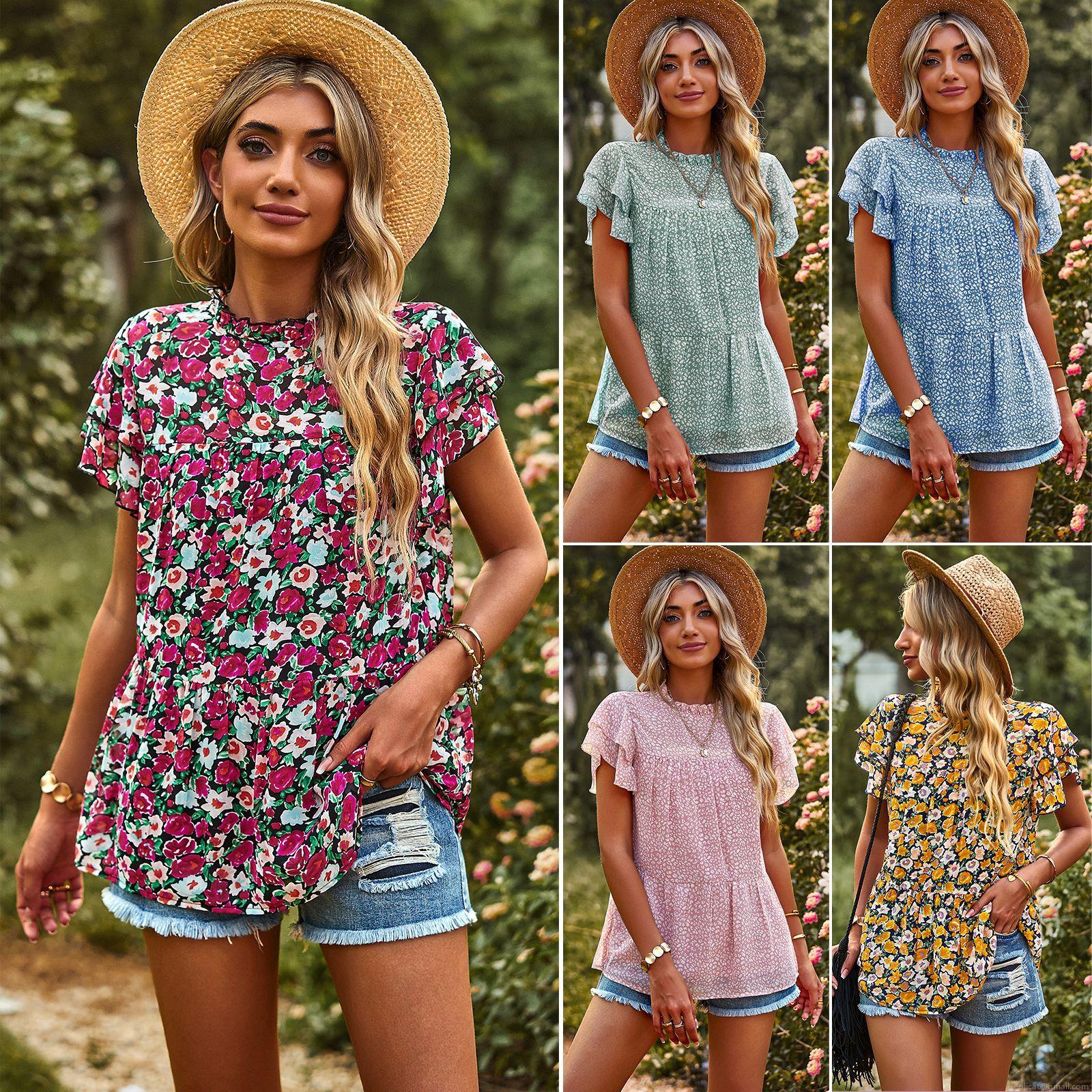 • Women's Floral Print Round Neck Ruffle Sleeve Blouse Casual Lightweight Tiered Hem Summer Peplum Tops For Vacation
