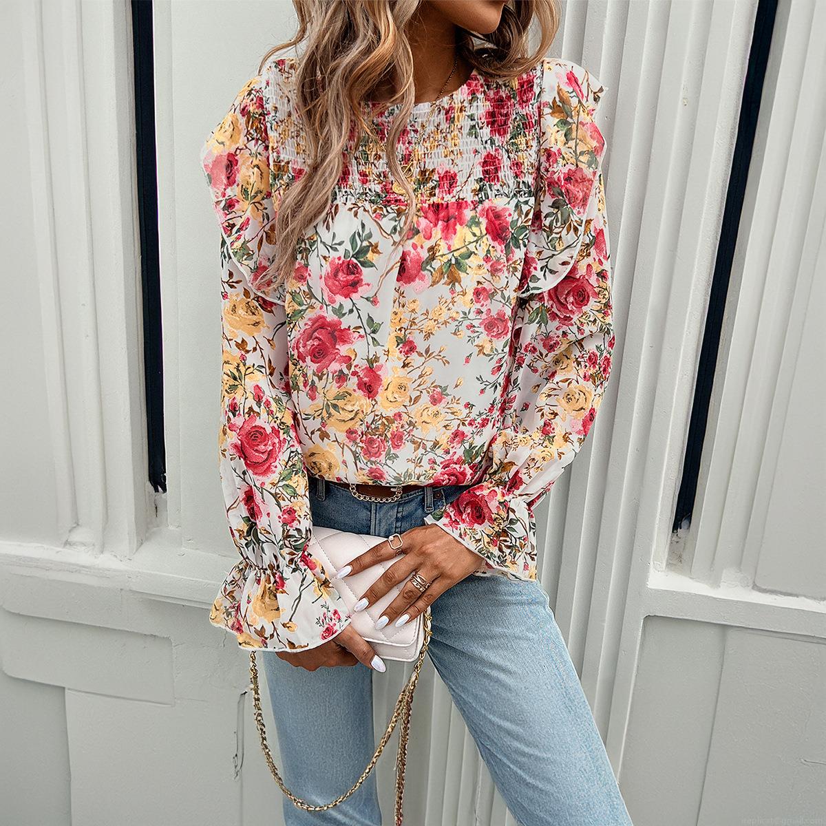 • Women's Floral Print Smocked Chiffon Blouse Elegant Long Ruffle Sleeve Round Neck Pullover Shirt Casual Office Daily Wear Top