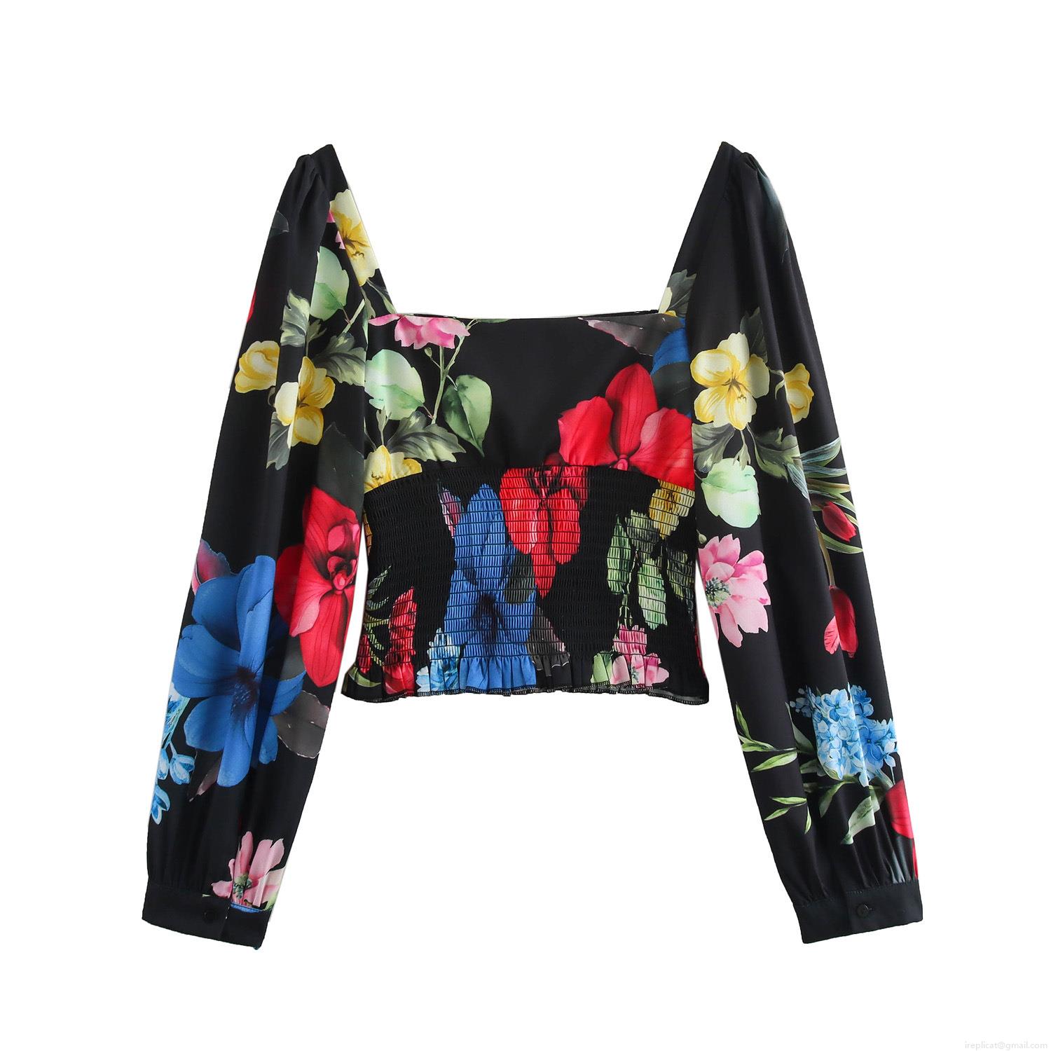 Women's Floral Print Square Neck Blouse Puff Long Sleeve Smocking Slim Fit Crop Top Polyester Vintage Style Shirt for Casual Party Ladies Fashion