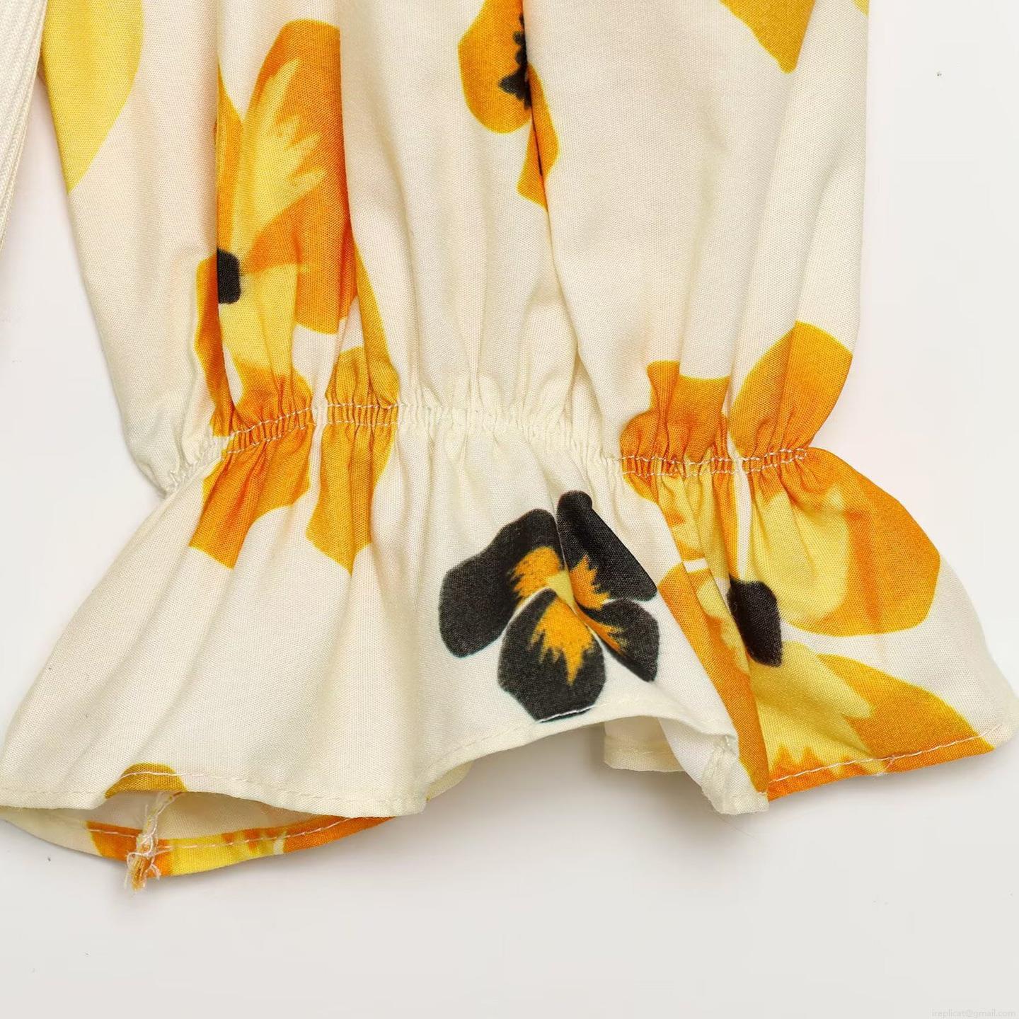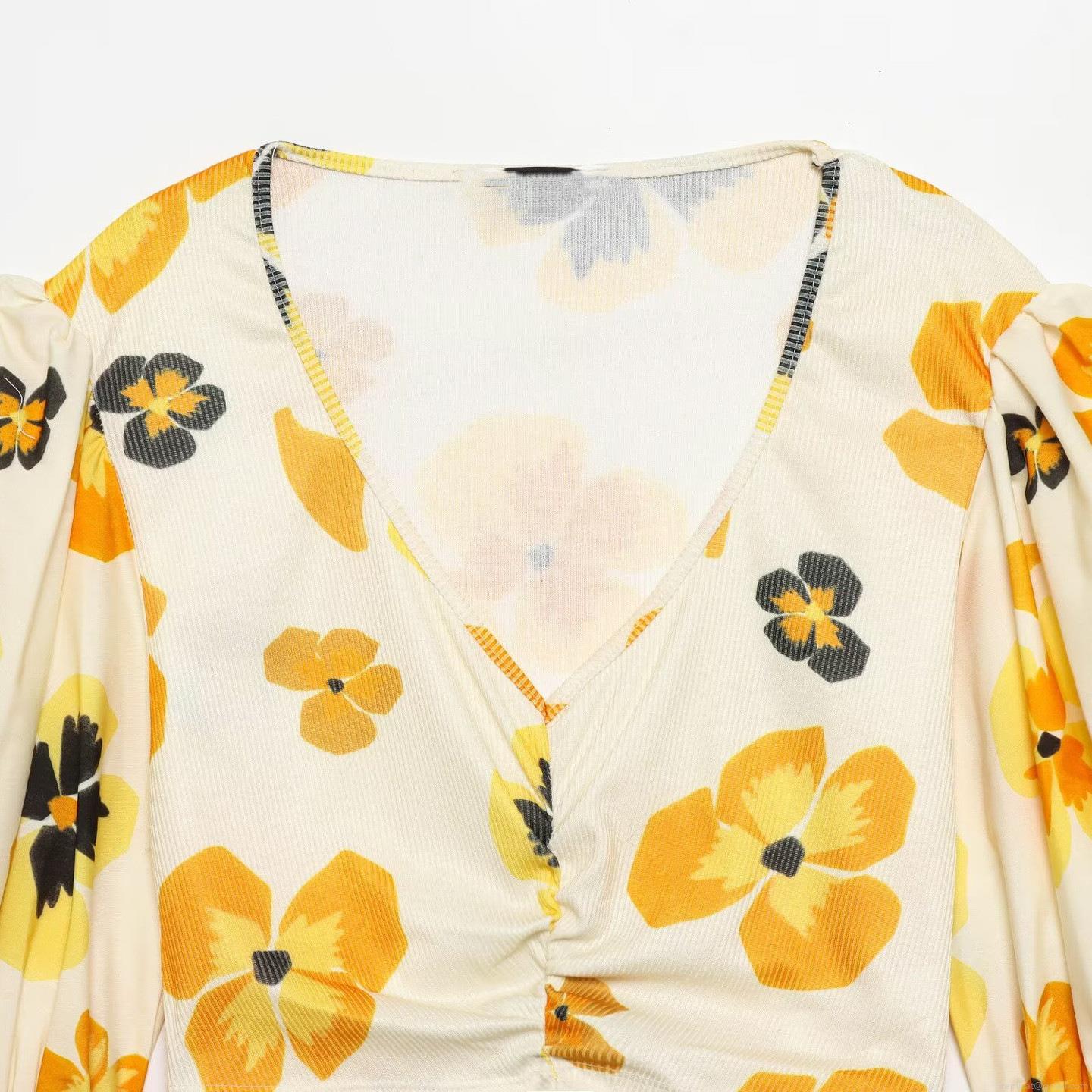 Ruffles, Flowers, Printing, V-neck, Gathering, Puff Sleeves