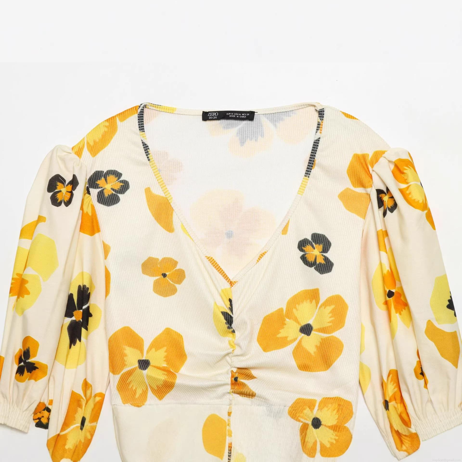Sunflower, Pleats, Ruffles, Flowers, Printing, V-neck, Puff Sleeves