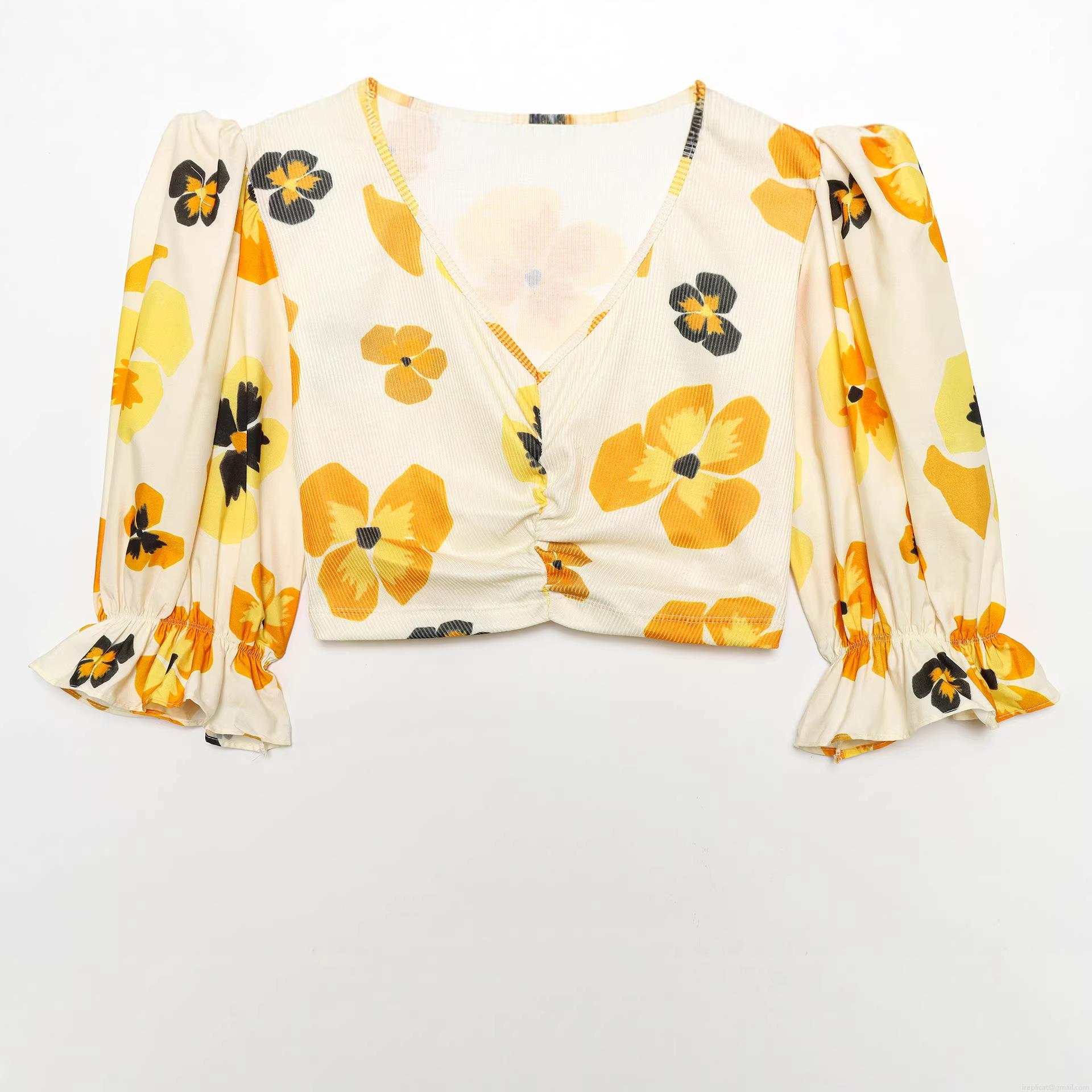 • Women's Floral Print V-Neck Ribbed Crop Top Long Bubble Sleeve Ruffle Cuff Polyester Elegant Sweet Fashion Blouse Top