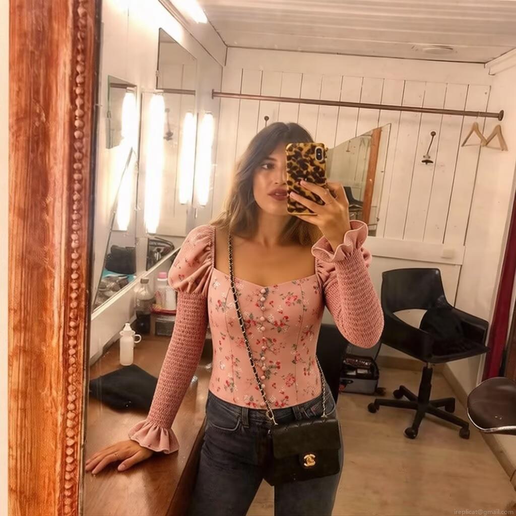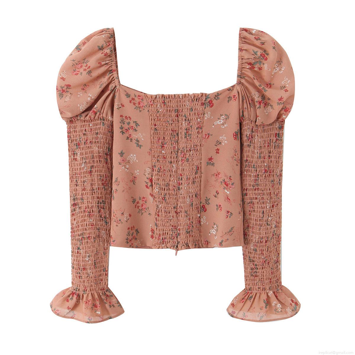Wood Ear Edge, Floral Pattern, Buckle, Gathering, Puff Sleeves, Square Collar, Elasticity And Tightness
